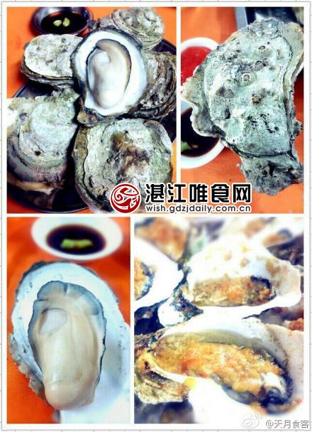 湛江生蚝以碳烧而闻名,遂溪北潭产区的生蚝更以肉质鲜甜而知名北潭蚝属于滩涂石柱养殖[非蚝排挂网养殖],因生长期长蚝壳厚而耐烧,最适合碳烧。“碳烧生蚝”常见有原只原味烤、开壳蒜蓉烤两种,口味重者好蒜蓉烤,个人偏爱原味烤,能吃到鲜甜味及海水味,蘸芥末吃更妙
