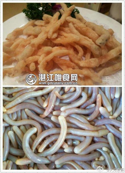 湛江位于北部湾畔盛产沙虫,遂溪县下六镇旧庙出产的沙虫更以大鲜嫩而知名,传统有鲜沙虫与沙虫干两种吃法。鲜沙虫可煮汤、蒜蓉蒸、酥炸、炒吃、煮粥、生腌、冰镇…;沙虫干可煮粥、煮汤、椒盐、焖煮南瓜萝卜丝…。味道鲜美甜口,固肾补气,沙虫干煮粥治小孩尿床有效