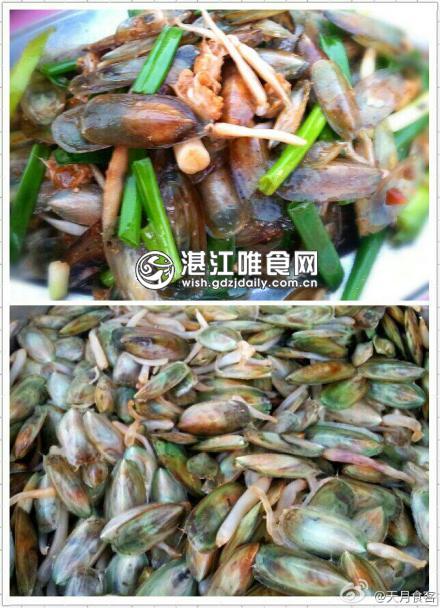 海豆芽,[湛江雷州话叫:ga qio]一种上万年历史的古生物贝类。在湛江有大小两品种,大的芽粗肉质也粗,小的肉细嫩鲜美,个人更钟情于后者老家遂溪北潭的红树林滩涂地尤其盛产小海豆芽,记得小时候老爸用葱炒之出锅前勾点薄芡就已经鲜美无比了,甚爱!每次回家必吃