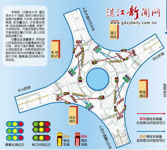 湛江新闻网讯:我市中心三帆环岛目前已启用灯控管理,三天来,实际效果明显,车流量加大,行车更加有序,安全性得到极大提高,深受广大市民好评。只是还有部分司机不是很适应看灯行驶,进入环岛前后清动作犹豫不决,湛江交警在此温馨提示,司机驶入环岛前后务必先看清信号灯后行驶。结合下面两张示意图,帮助广大司机朋友进一步熟悉驶进环岛前和在环岛内如何看准交通灯,按灯行驶,提高通过效率和行车安全性。