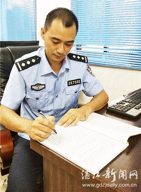2005年,他不顾家人反对,参加了当年的公务员招警考试。从那时起,在授课之余,他每天总要挤出时间埋头在公务员考试书籍中,经历笔试、面试,终于梦想成真,考入雷州市公安局,成为一名人民警察。
