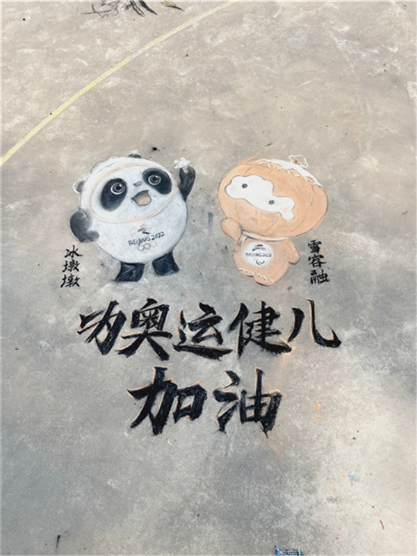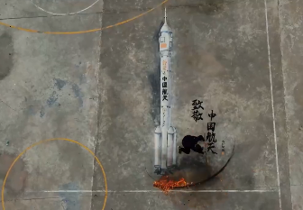“航天点亮梦想!”2022年4月24日是第七个“中国航天日”,记者追踪采访了解到:温康龙4月22日再次用特别的作画工具——烧火棍和砖头在地面绘制航天主题作品,纪念“中国航天日”的到来。