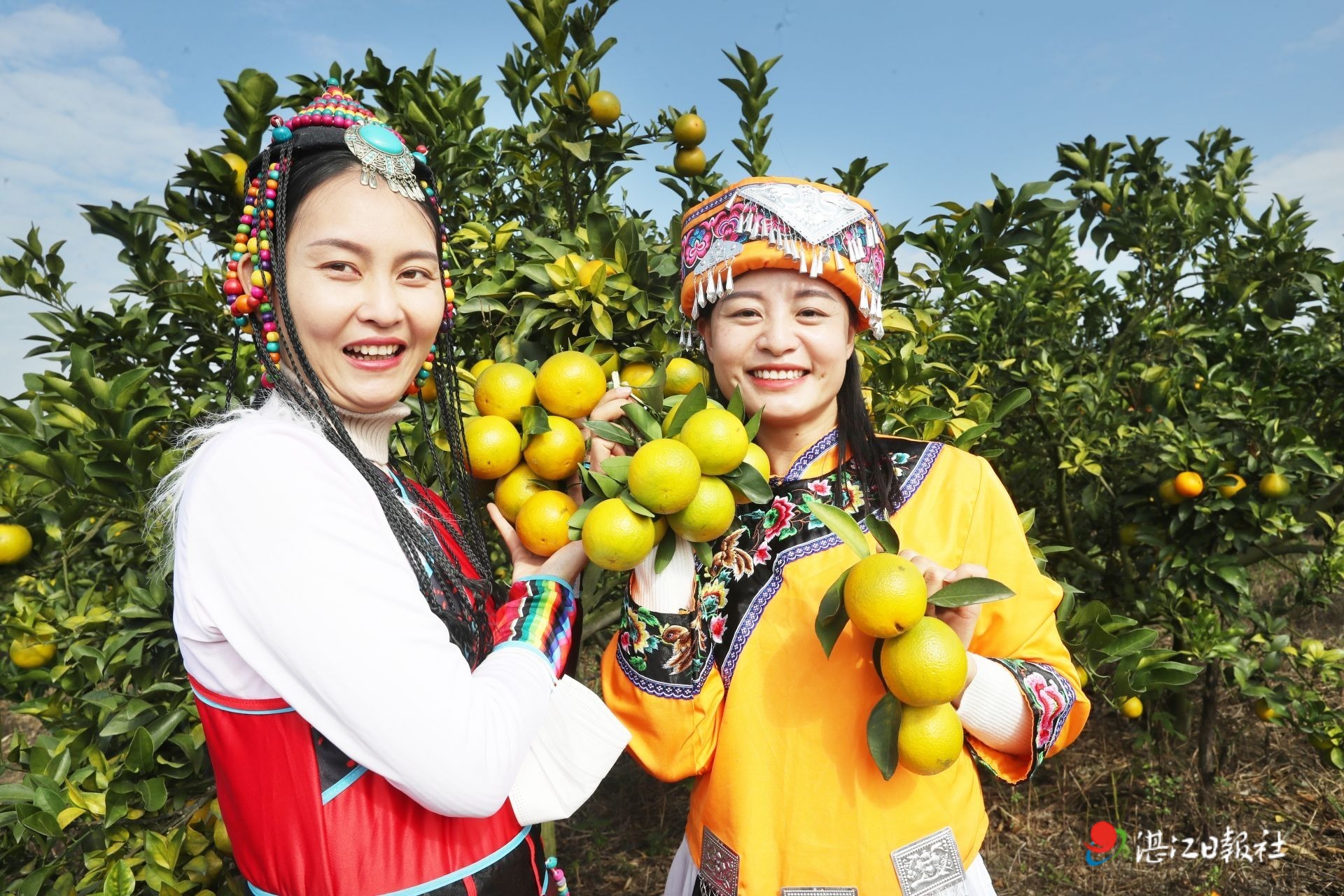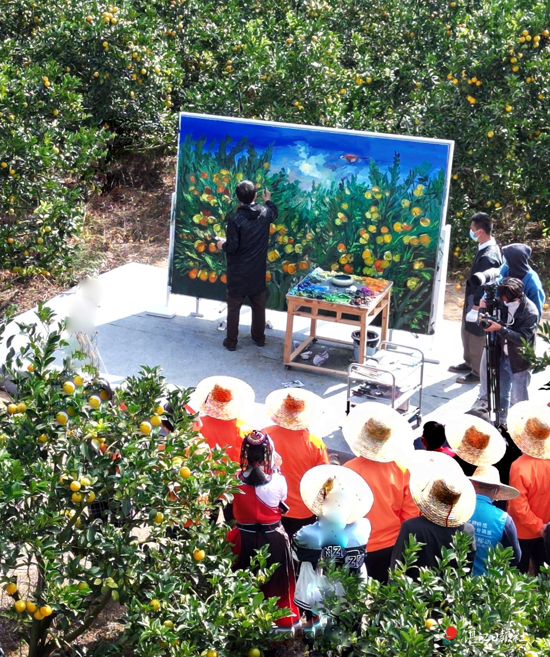 - 初冬暖阳,刚经过寒风“洗礼”的廉江红橙,更添了几分鲜甜,沉甸甸的果实坠满枝条。身着少数民族服装的采橙工忙着采摘,周昌新在摄影机前简要介绍这次画红橙的构思后,便开始创作。