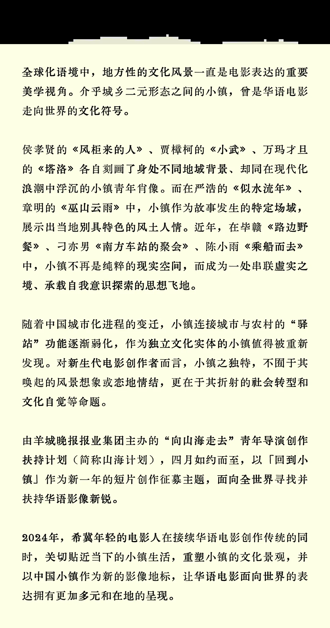 2024年,山海计划以“回到小镇”作为新一年的短片创作征募主题,希冀年轻的电影人在接续华语电影创作传统的同时,关切贴近当下的小镇生活,重塑小镇的文化景观,并以中国小镇作为新的影像地标,让华语电影面向世界的表达拥有更加多元和在地的呈现。