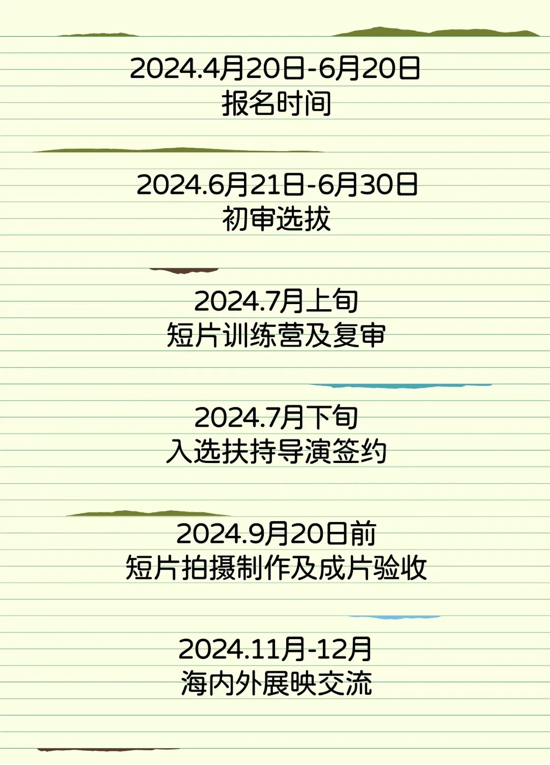 5、入选扶持计划的青年导演需承诺在2024年9月20日前完成短片拍摄制作并获得评委会终审认可,短片时长为10~20分钟,类型不限(包括剧情片、纪录片、实验片、动画等,广告除外),配中英法三语字幕(中文字幕内嵌;英、法字幕外挂);