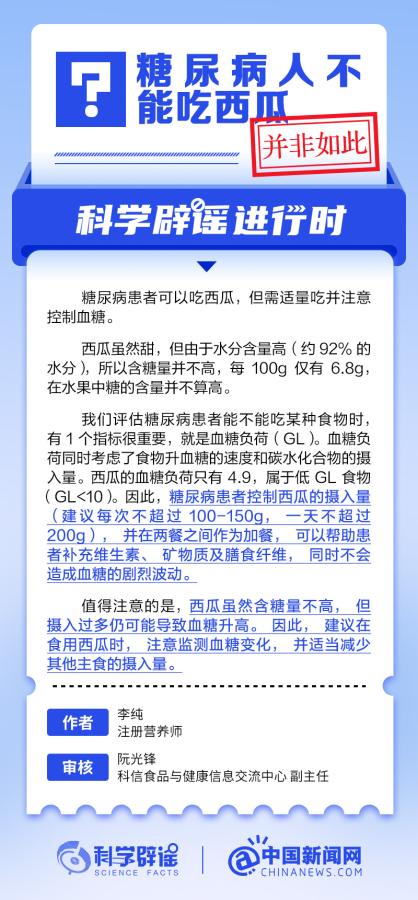 西瓜虽然甜,但由于水分含量高(约92%的水分),含糖量每100g仅有6.8g,在水果中糖的含量并不算高。糖尿病患者可以吃西瓜,但需适量吃并注意控制血糖。