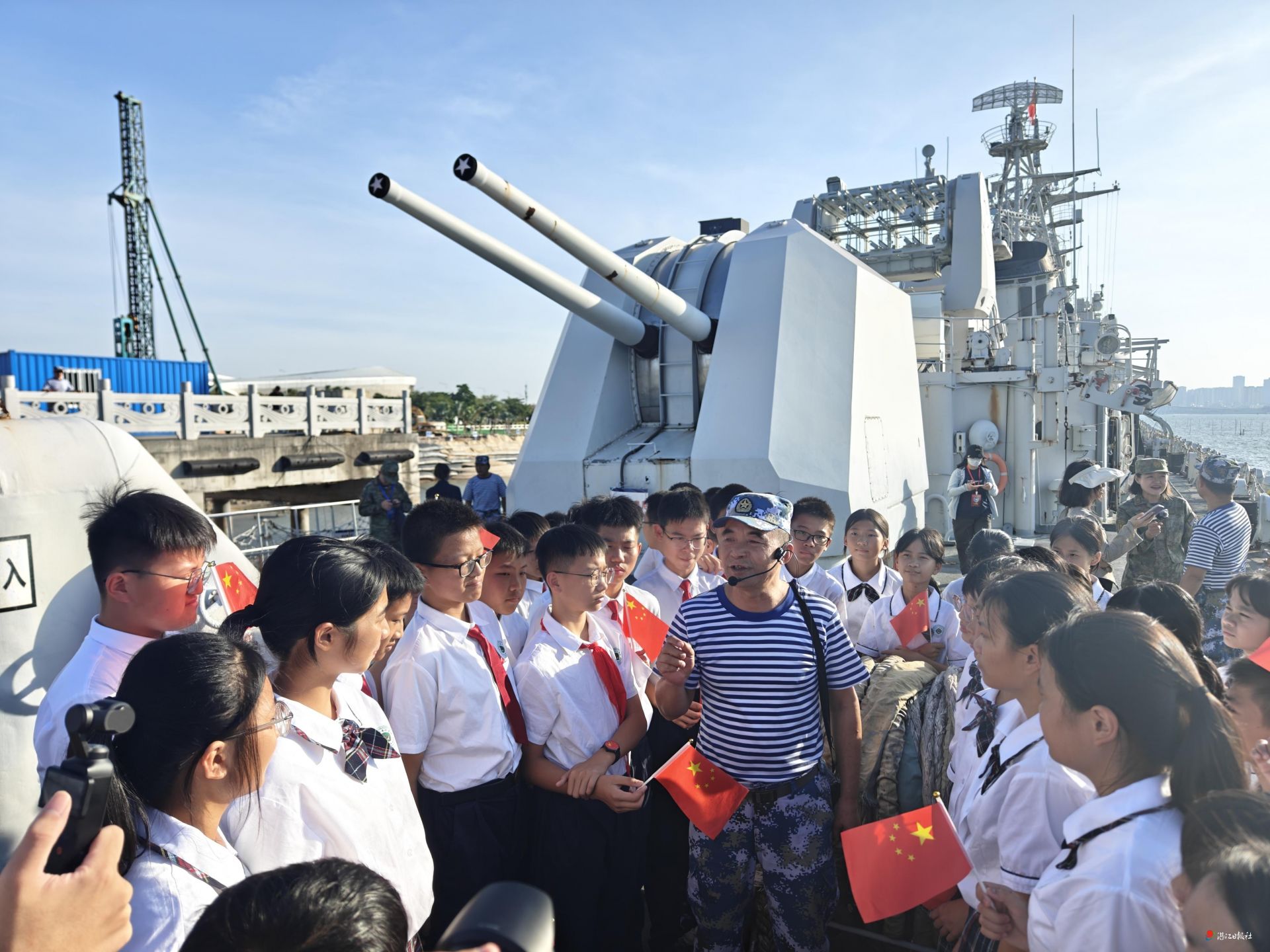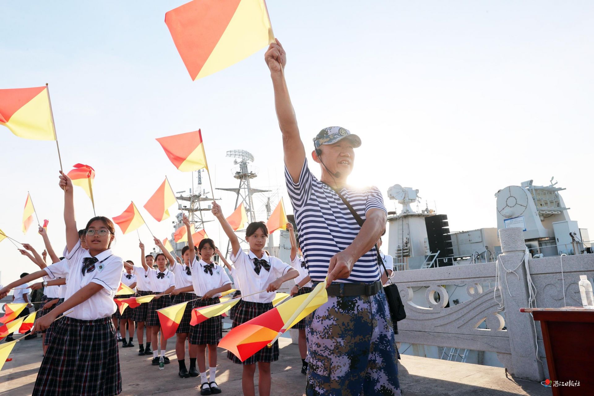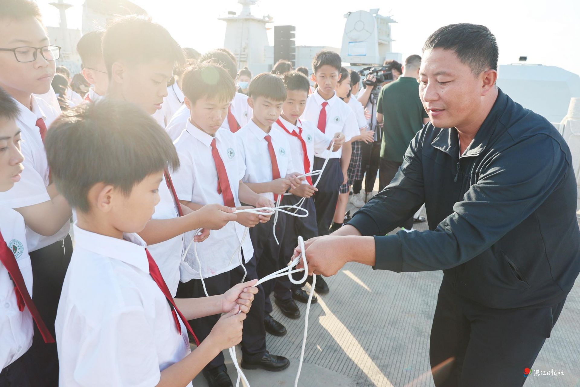 - 另一边,学生们登上舷梯走进退役的湛江舰、潜艇,好奇地观察着各种设备。活动现场,学生们在退役潜艇的展板上郑重签字,签下自己对南海的一片深情,对祖国的无限热爱。在舰艇上,学生们还学习了如何打旗语、打绳结这两项充满海军特色的技能。