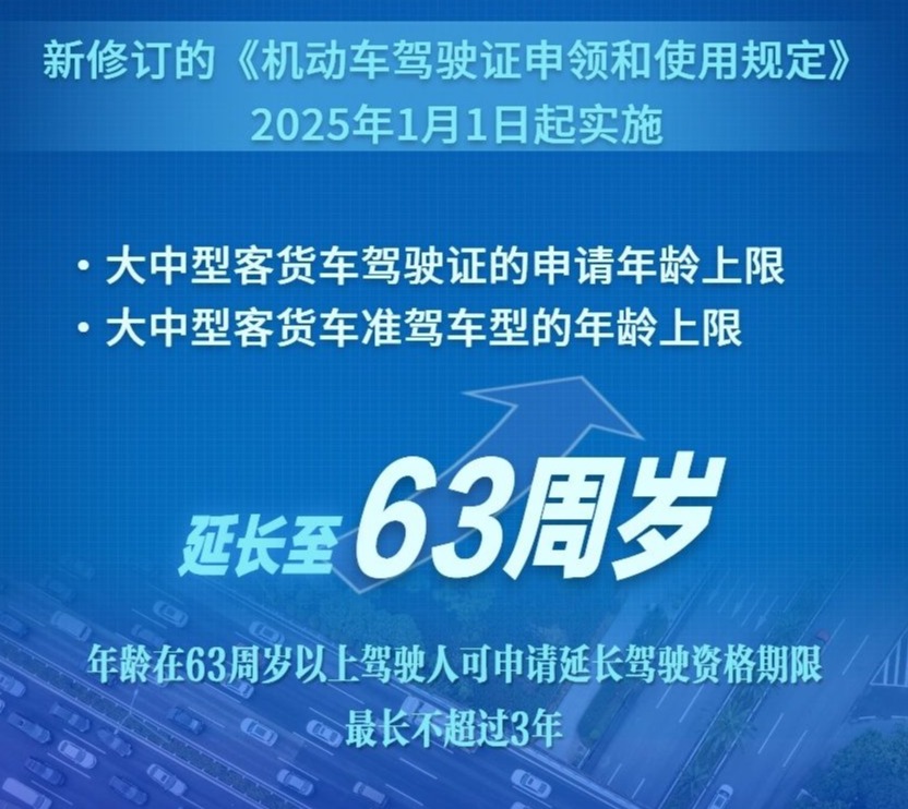 来自四川西昌的“廖*”、来自陕西渭南的“樊**”等网民留言反映,根据新修订的《机动车驾驶证申领和使用规定》,63岁之前和63岁之后符合一定条件都能继续驾驶大型客货车,但当前一些已满60岁不足63岁、身体健康的大型客货车驾驶员的驾驶证已经从A、B类被降为C类。希望能将符合条件人员所持的驾驶证恢复至降级前的类型,让他们能继续拉货跑运输。为贯彻落实国家关于实施渐进式延迟法定退休年龄有关规定,更好地适应经济社会发展和人民群众的实际需求,公安部已对《机动车驾驶证申领和使用规定》进行了修订,将大中型客货车驾驶证的申请年龄上限由60周岁延长至63周岁,大中型客货车准驾车型的年龄上限由60周岁延长至63周岁,并明确年龄在63周岁以上需要继续驾驶大中型客货车的驾驶人,体检合格和通过记忆力、判断力、反应力等能力测试后,可以向车辆管理所申请延长原准驾车型驾驶资格期限,延长期限最长不超过3年。同时,公安部将指导各地公安交通管理部门做好因年龄原因被注销驾驶证人员的驾驶资格恢复工作,保障大中型客货车驾驶人驾驶机动车权益。新修订的《机动车驾驶证申领和使用规定》(公安部令第172号)自2025年1月1日起实施。(公安部 交通管理局)