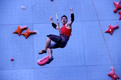 沃森在比赛中庆祝。图片来自国际攀联官方社交媒体账号