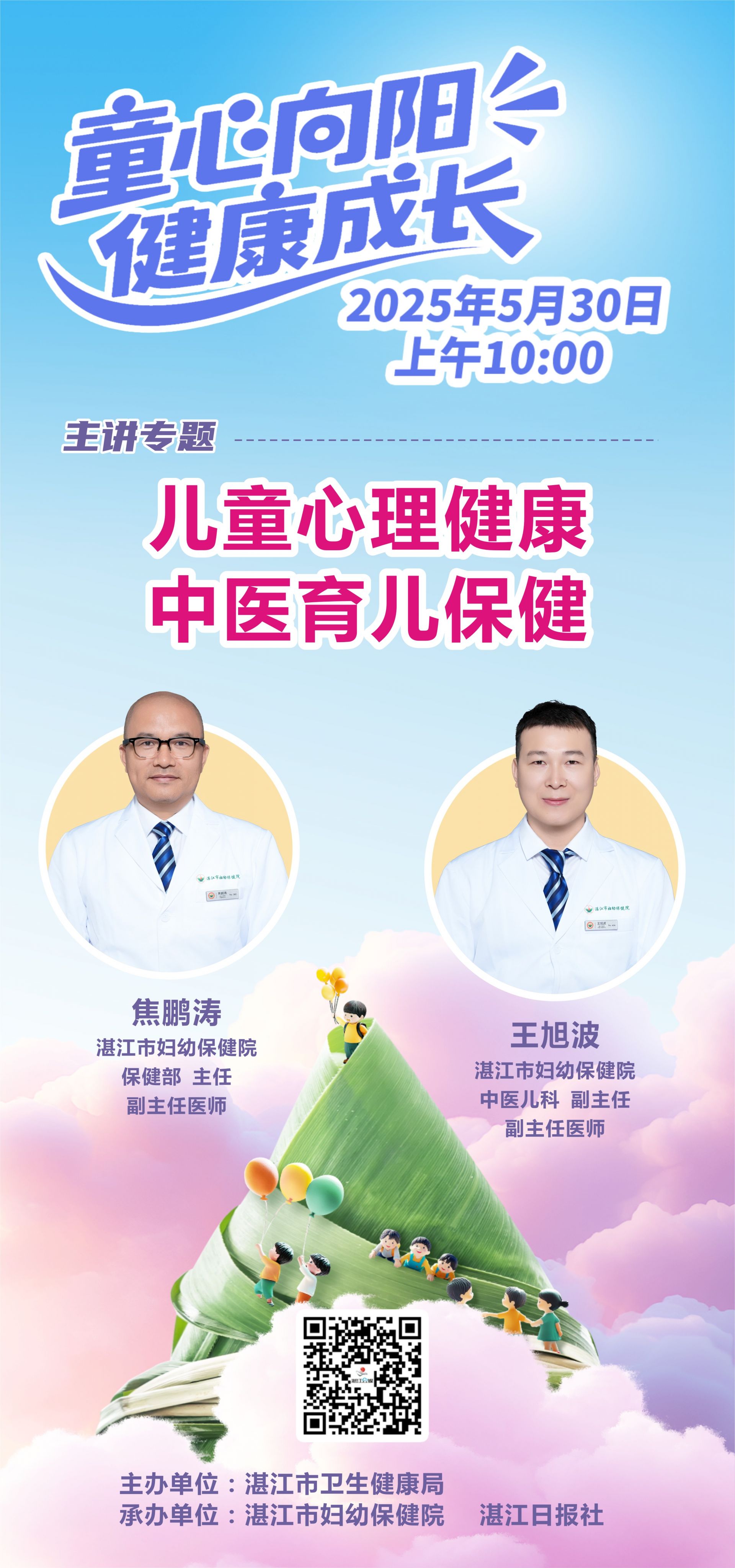 ”在“六一”国际儿童节即将到来之际,为帮助家长更好地关注儿童身心健康,5月30日,湛江市妇幼保健院与湛江日报社将联合举办“关注儿童心理健康与中医育儿保健”专题直播活动。届时,广东省基本公共卫生服务项目绩效评价专家库成员、湛江市妇幼保健院保健部主任、副主任医师焦鹏涛,以及中医儿科副主任、副主任医师王旭波将做客直播间,为广大家长带来科学、实用的儿童健康管理知识,助力孩子健康成长。