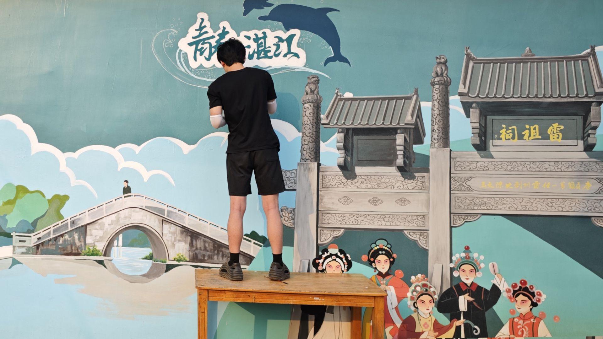 近日,广东海洋大学中歌艺术学院师生走进雷州市陈家桥风貌示范带,与团雷州市委联合开展“美育浸润”墙绘活动。师生们以雷州本土文化、自然风光为主题,在乡村墙面创作出多幅色彩明快、主题鲜明的艺术作品,涵盖石狗非遗、红树林生态等元素,既美化村容村貌,又成为传播乡村文化的新载体。