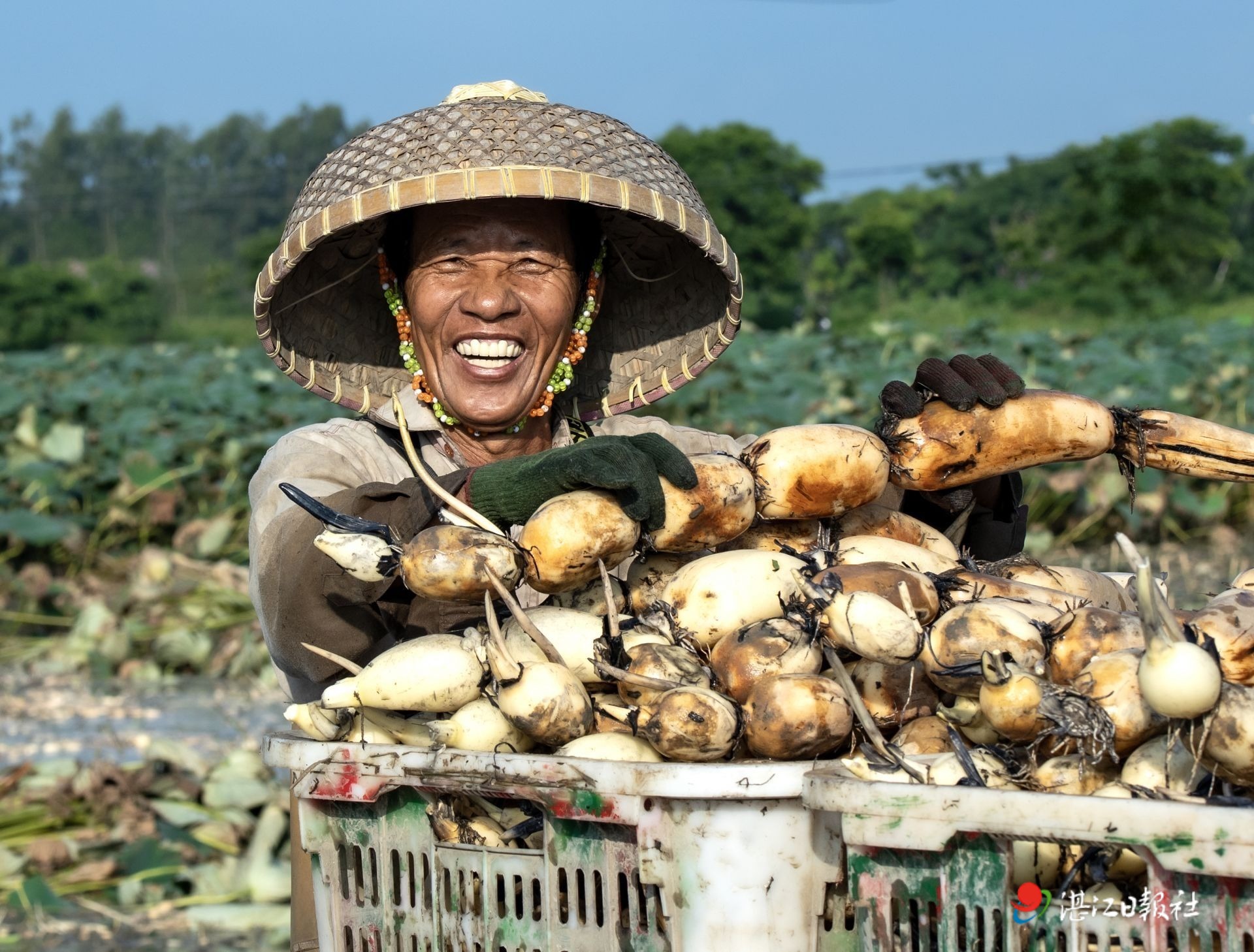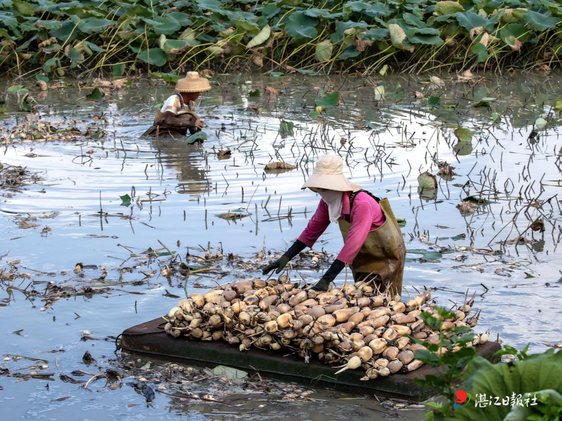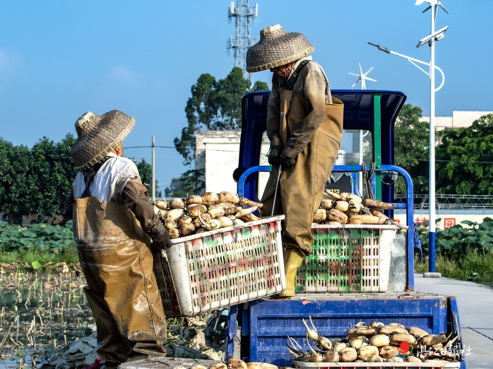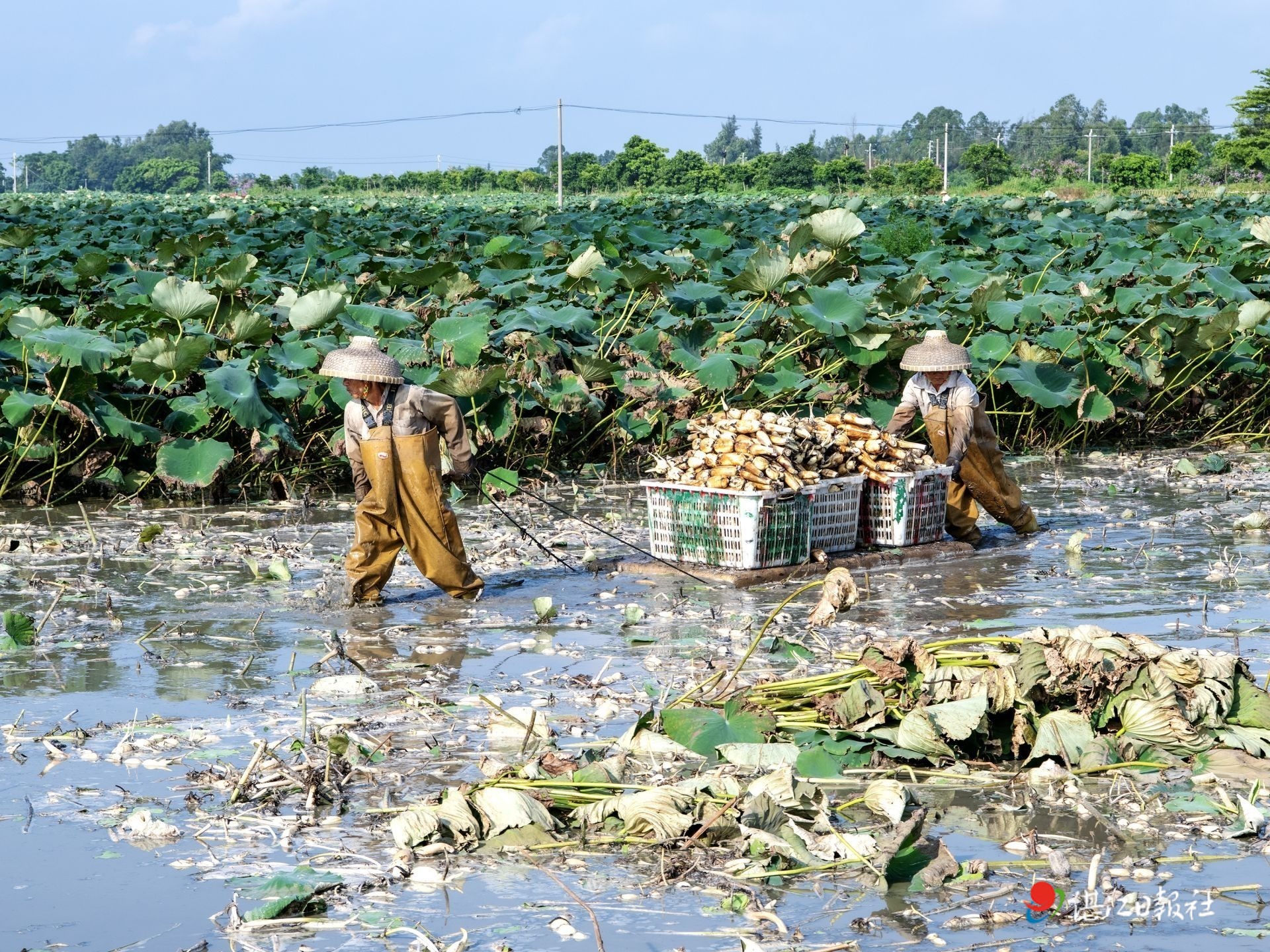 7月6日,夏日的阳光洒在坡头区乾塘镇梅魁村的藕塘,映照出一派热火朝天的丰收景象。藕农们穿梭在荷塘间,采挖、搬运、整理莲藕,用辛勤劳作勾勒出乡村振兴的生动图景。