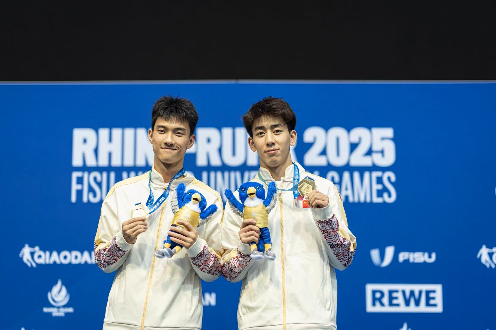 2025年世界大学生夏季运动会跳水男子双人10米台决赛中,中国组合郑均之/莫永华(左)获得冠军。新华社发