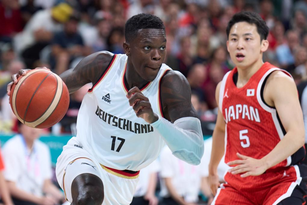 2024年7月27日,德国队球员施罗德(左)在巴黎奥运会男子篮球小组赛中。新华社记者 孟鼎博 摄