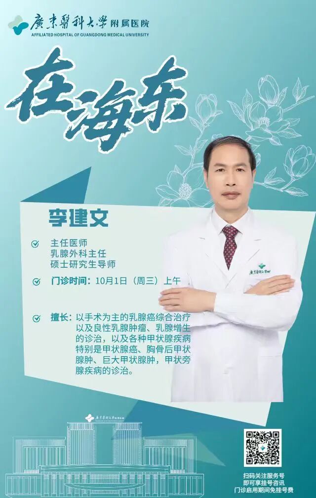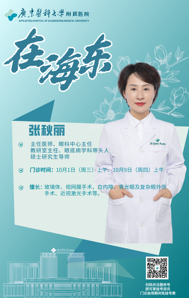 编者按 广东医科大学附属医院海东院区门诊拟于今年 10 月 1 日启用,《在海东》系列推文将分期介绍海东院区门诊启用期间(十月份)出诊的各科室专家。这些专家学者深耕临床一线多年,凭借深厚的专业功底与丰富的诊疗经验,成为各专科领域的权威代表。我们邀您一同走近这些医者,共赴这场守护健康的美好之约。 Tips:海东院区门诊启用期间(十月份),所有专家门诊均免挂号费。 编辑:岑川 值班主任:周文硕