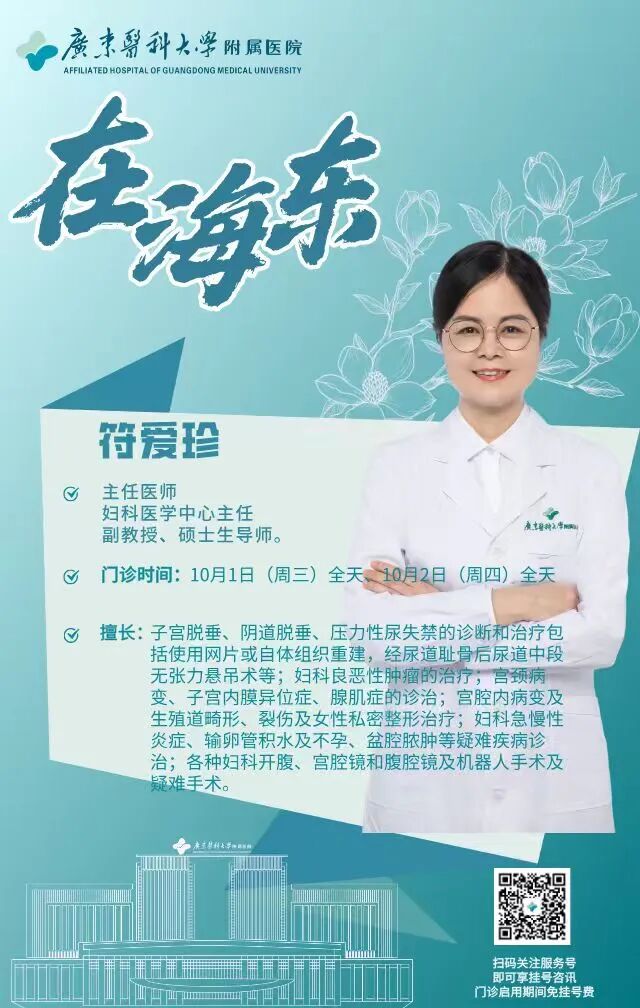 编者按 广东医科大学附属医院海东院区门诊拟于今年 10 月 1 日启用,《在海东》系列推文将分期介绍海东院区门诊启用期间(十月份)出诊的各科室专家。这些专家学者深耕临床一线多年,凭借深厚的专业功底与丰富的诊疗经验,成为各专科领域的权威代表。我们邀您一同走近这些医者,共赴这场守护健康的美好之约。 Tips:海东院区门诊启用期间(十月份),所有专家门诊均免挂号费。