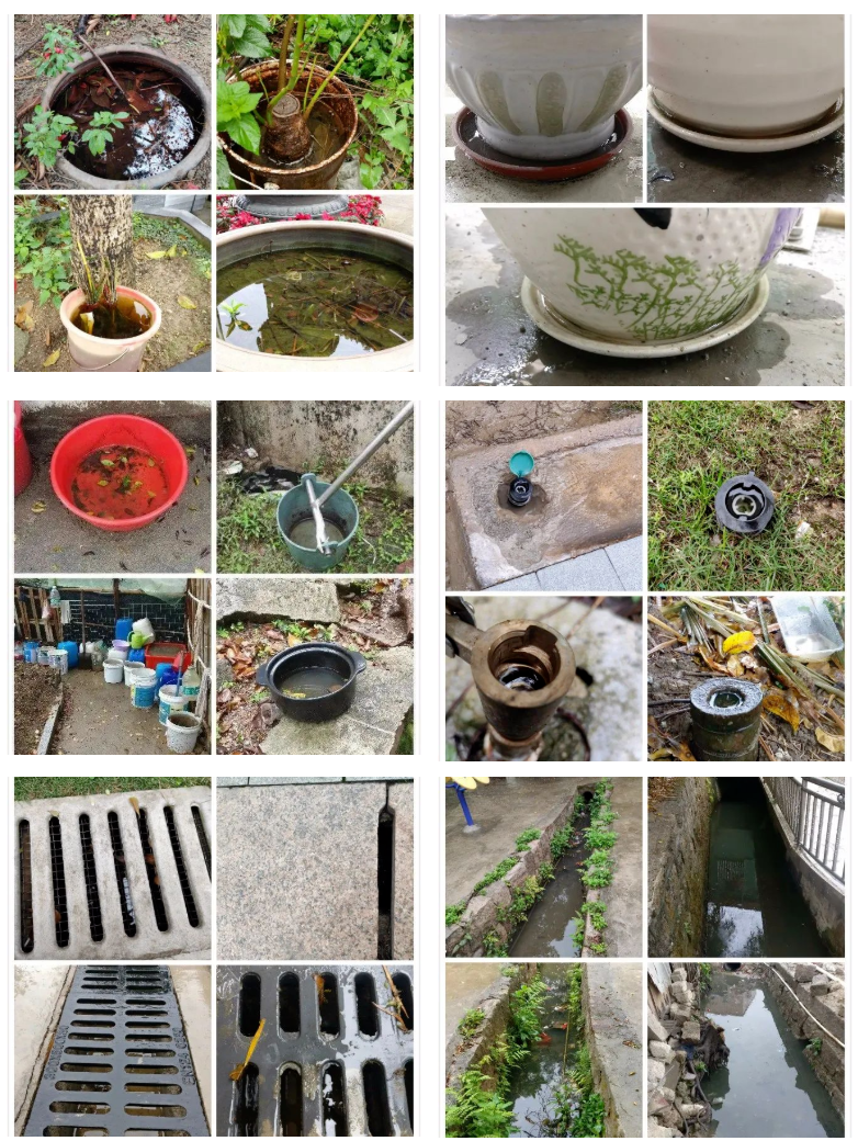 庭院积水点:旧轮胎、瓦砾、落叶堆、假山水池、闲置水桶。