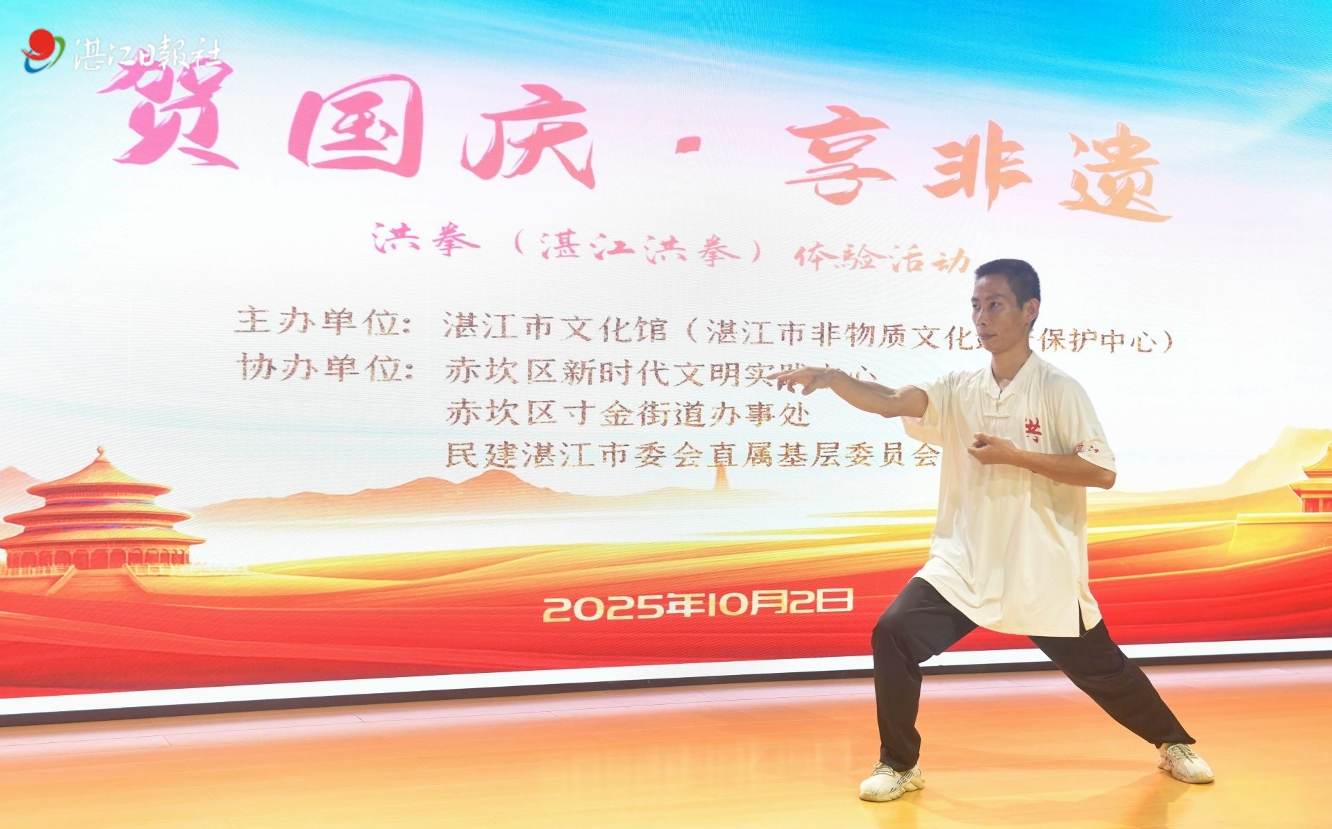 10月2日,“贺国庆 享非遗”--洪拳(湛江洪拳)体验活动在湛江市文化馆举行,50余名孩子参加了体验活动。本次活动皆在营造“人人知晓、热爱、学习传承非物质文化遗产”的浓厚氛围,增强少年儿童对当地非物质文化遗产的自豪感、荣誉感。活动中孩子们跟随洪拳师傅了解了洪拳(湛江洪拳)的历史背景、文化价值和保护现状,还在老师指导下亲自体验洪拳的基本套路,交流体会心得。