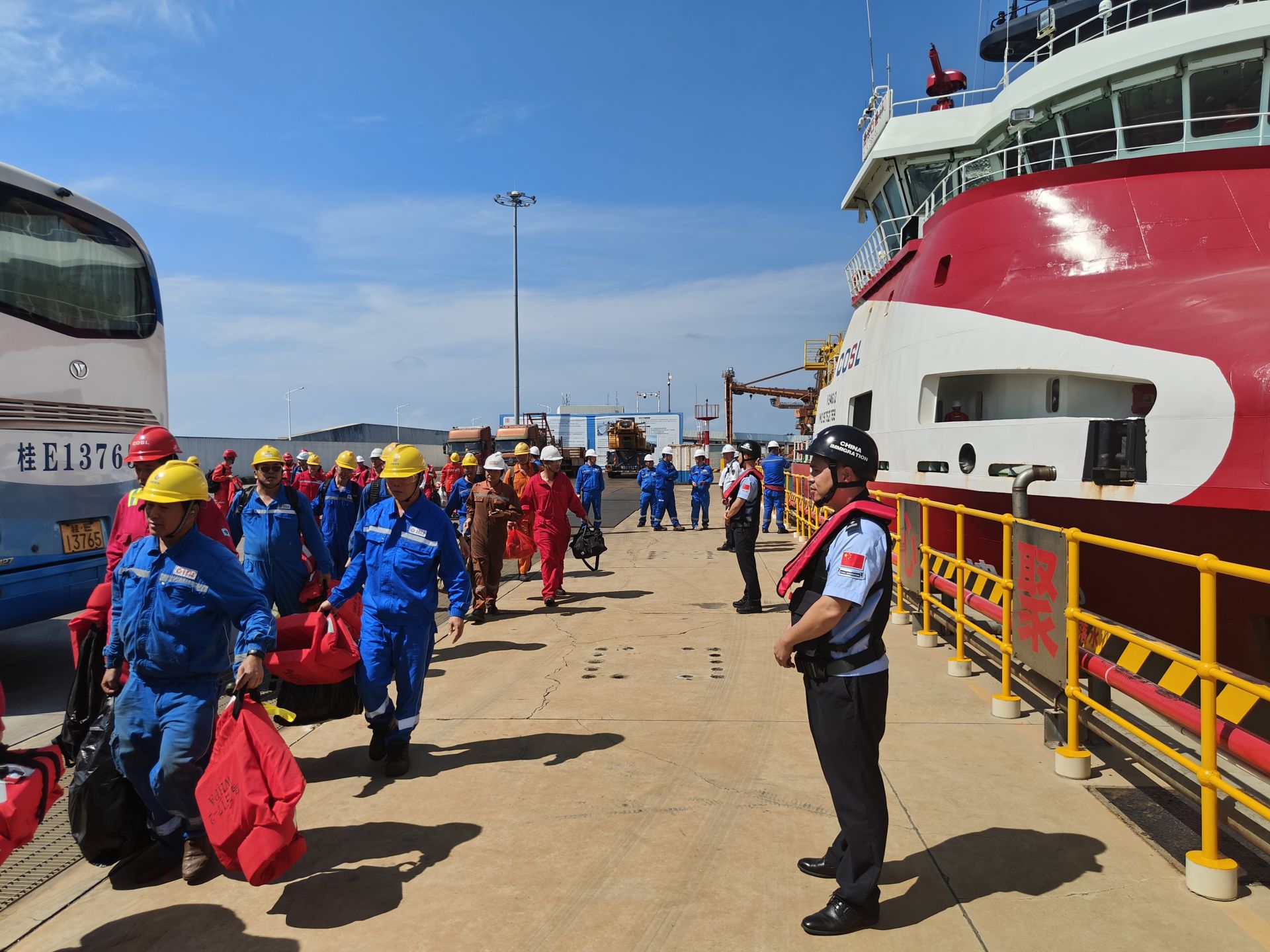 作为我国首个全方位绿色设计的海上油田群,乌石油田群位于北部湾海域,距离海岸线近23公里,由三座海上平台组成。为规避台风过境风险,油田运营方快速敲定撤离方案,安排应急船舶前往平台接运人员。其间,湛江边检站还主动对接口岸联检单位,实时跟踪撤离船舶动态,对载运撤离人员的船舶实行“即到即检、优先通行”。