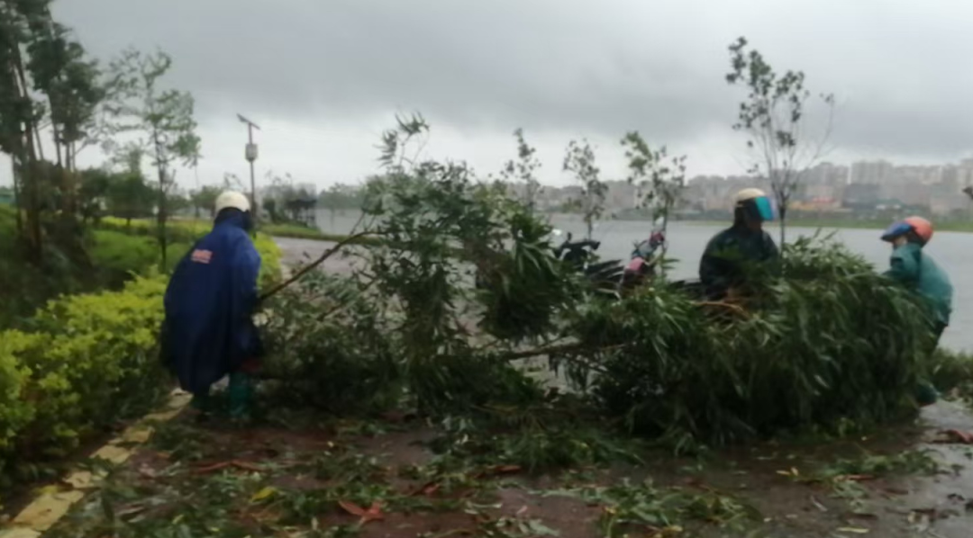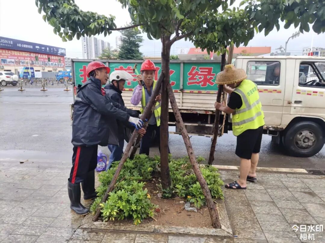 雷州市城综局干部对道路景观树进行加固及风雨中清理倒伏树木、断枝。