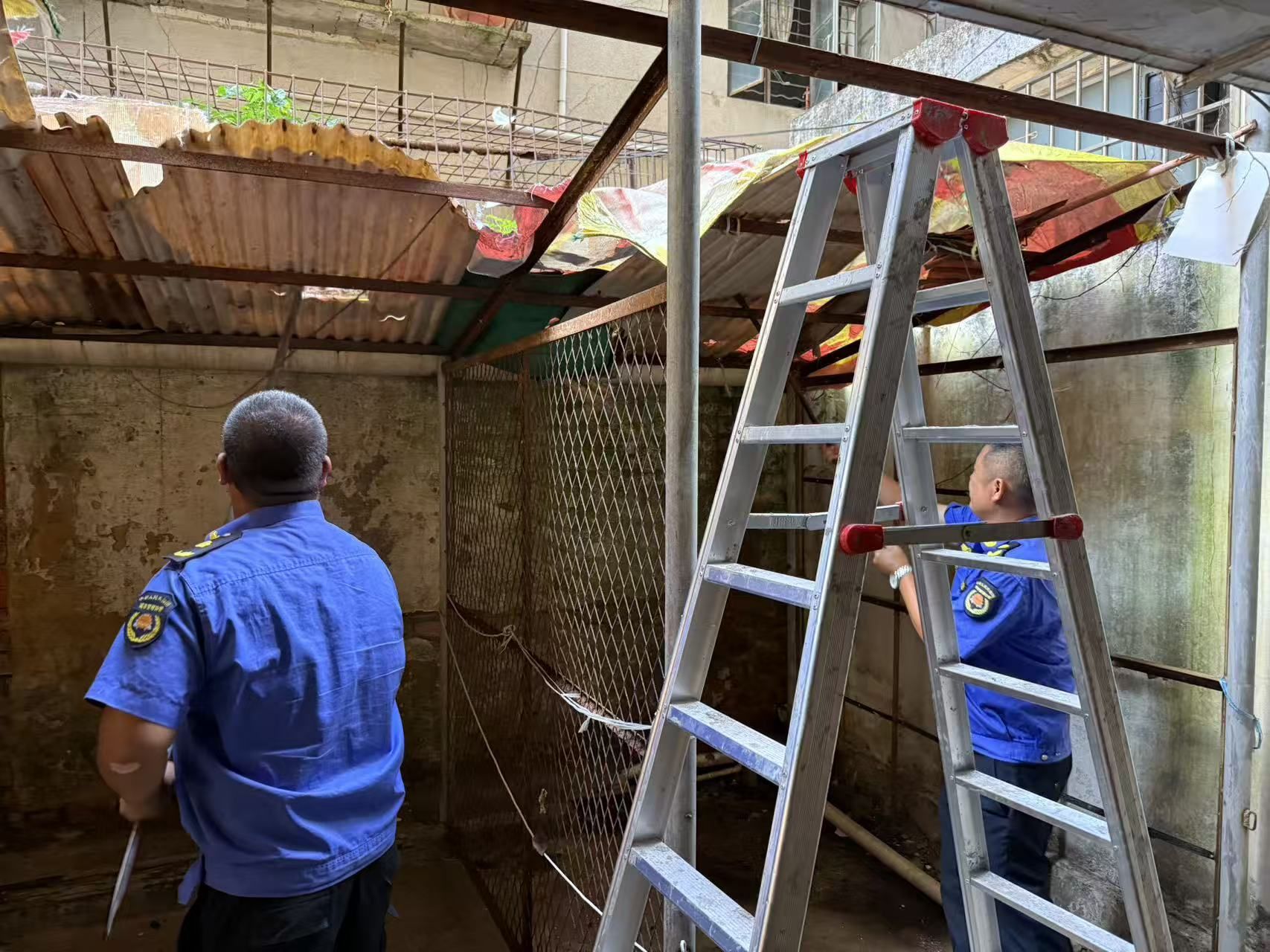 海景路海景市场路段受灾严重,多棵树木倒伏,阻断道路,居民出行受阻,日常生活受到较大影响。面对灾情,党员干部冲锋在前,干群齐心协力投入灾后恢复工作。现场忙碌有序:有人手持油锯,精准切割断枝,协助扶正倒伏树木,为生态修复夯实基础;有人清理散落的枝叶、垃圾和杂物,助力环境复原;还有人攀高协作,拆除被狂风卷挂于树梢的大型杂物,消除安全隐患,防止二次伤害。