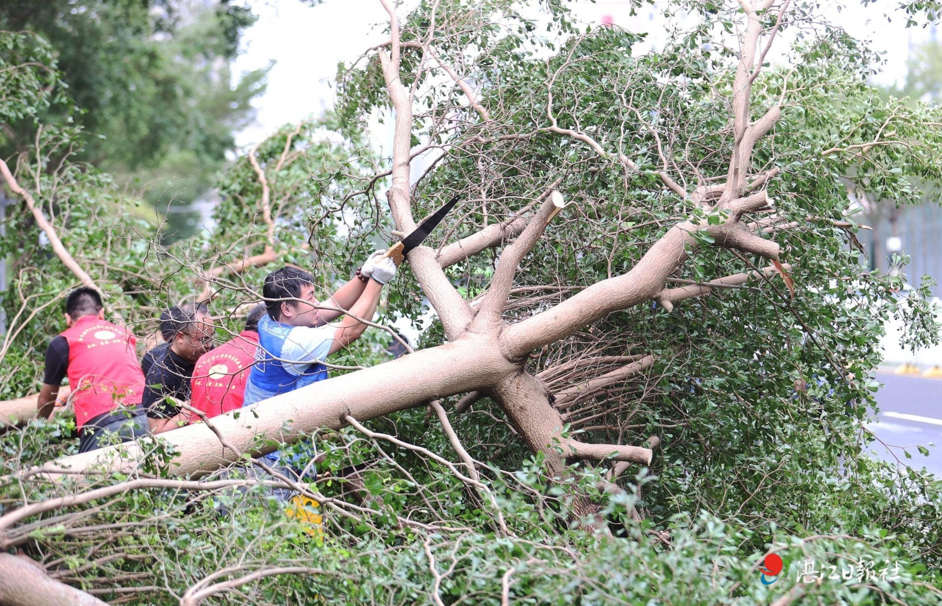 在霞山区解放街道民享东社区的清障现场,社区工作人员、街道干部、人民医院职工、民兵队伍并肩作战,有的清理断枝,有的疏导积水,有的排查隐患。“大家搭把手,把这棵树抬到路边!”随着一声呼喊,十几双手同时抓住树干,齐心协力将其移开。廉江城北街道的干部职工则分片包干,对辖区主干道的倒伏林木、破损广告牌进行全面清理,力争最短时间恢复道路畅通。