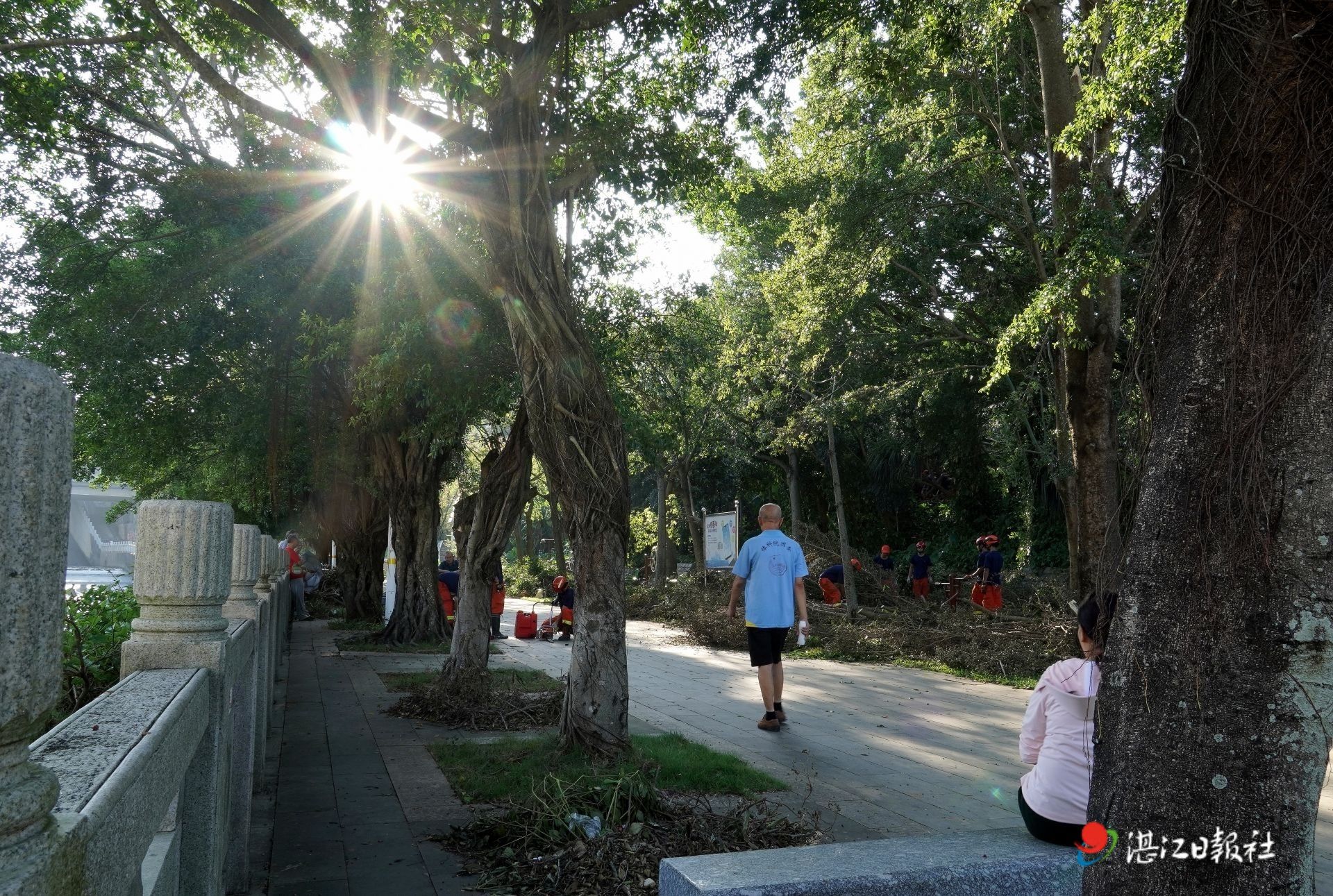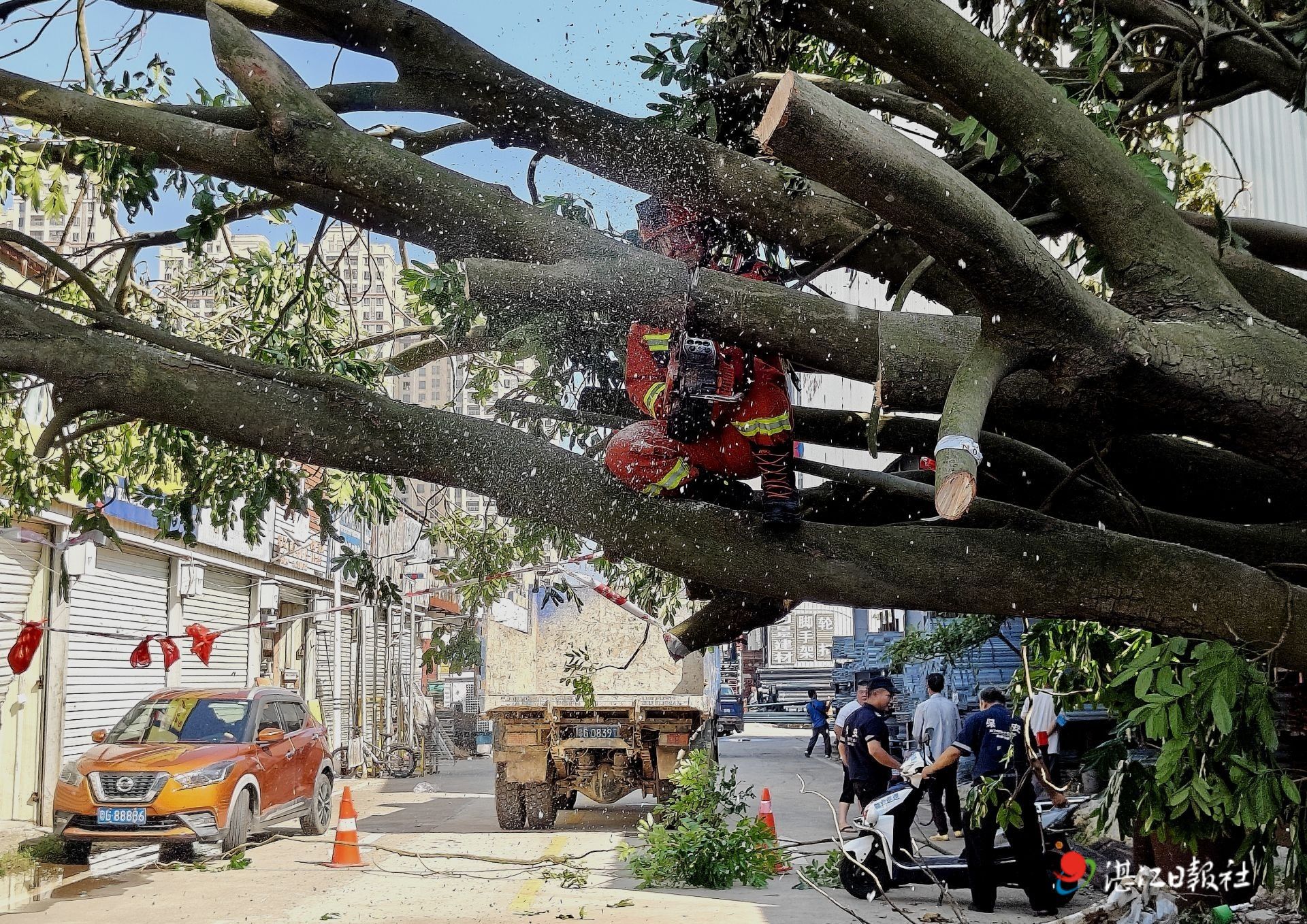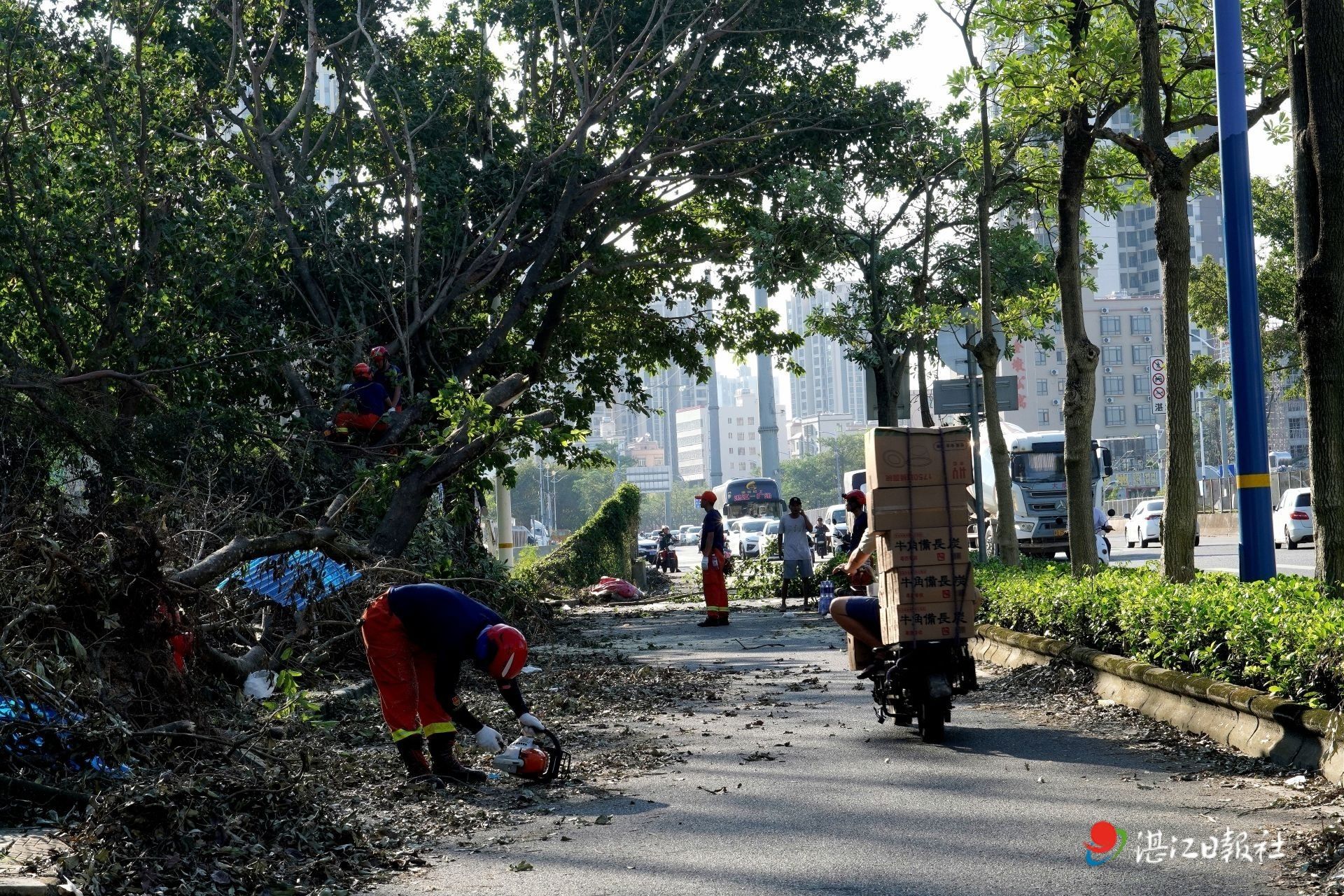 在人民大道北路、百蓬路等城市主干道,大型机械配合队伍有序清除悬挂树枝,地面人员及时清运,有效保障晚高峰交通顺畅。当天18时许,随着最后一处倒树点清理完毕,霞山区百蓬路全面恢复通行。