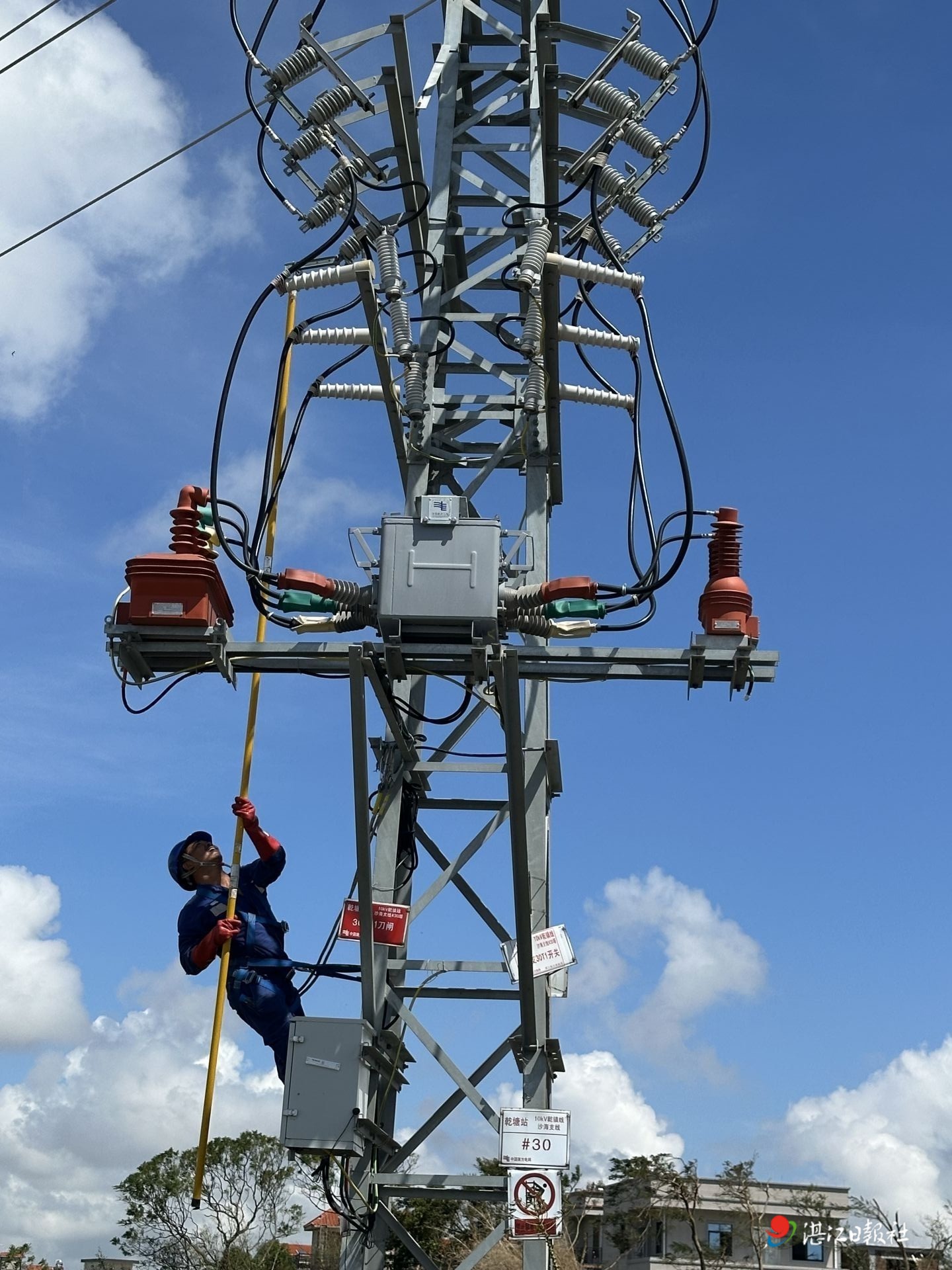 南方电网深圳大鹏供电局抢险队员登高作业,修复受损线路。