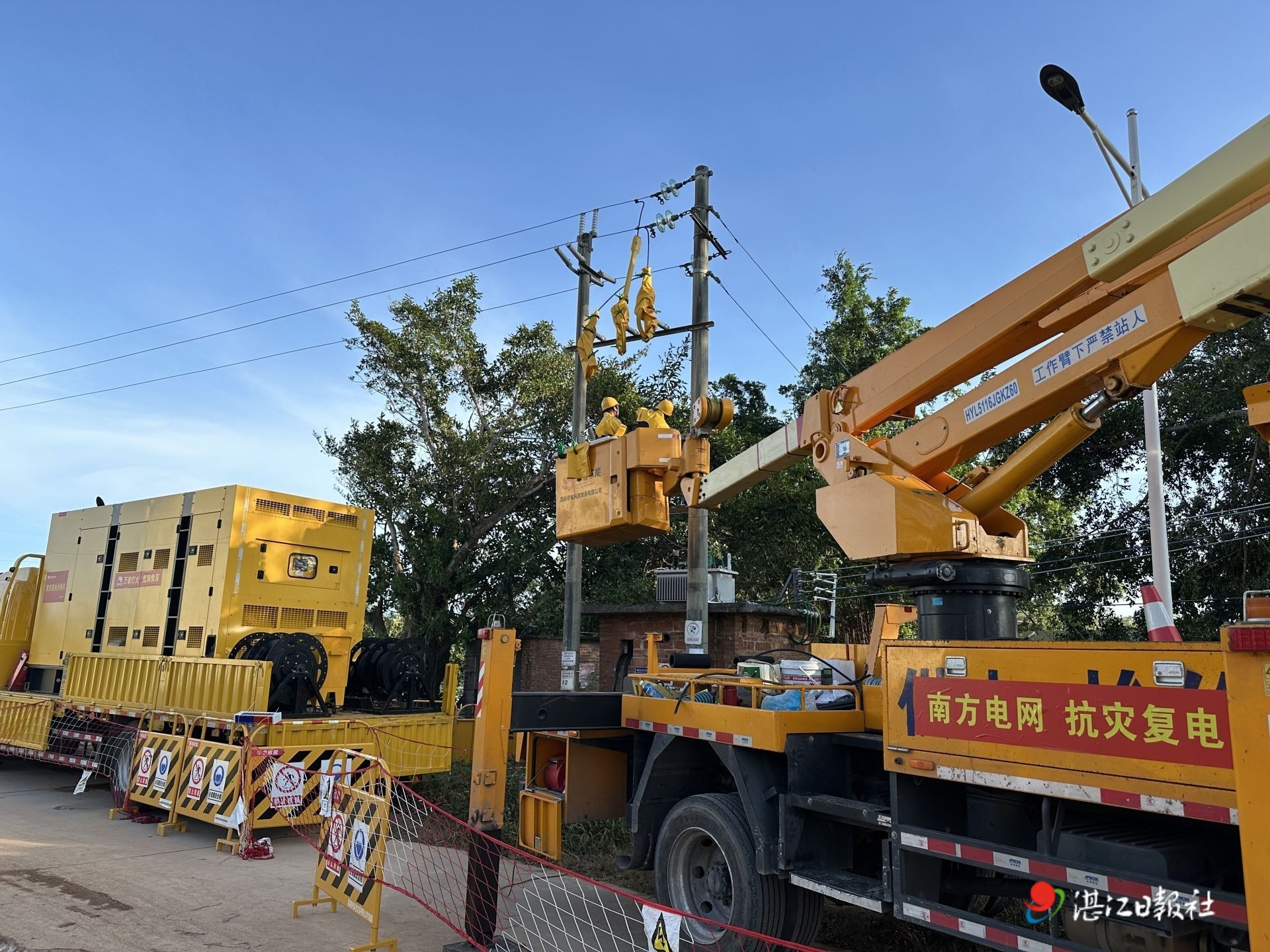 10月7日,在湛江吴川黄坡镇,南方电网深圳龙岗供电局支援队完成10千伏屋岭线抢修,抢险队伍调配3台特种作业车,全力以赴投入作业。