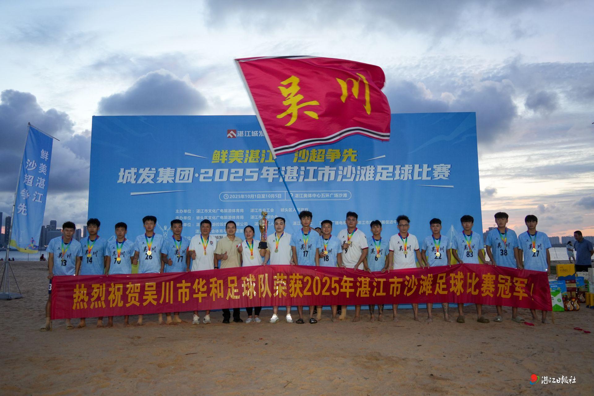 10月12日,城发集团·2025年湛江市沙滩足球比赛在湛江奥体中心五环广场沙滩落下帷幕。经过4天比赛的激烈角逐,吴川市队和宝钢湛江钢铁队分获县市区组和企事业组冠军。