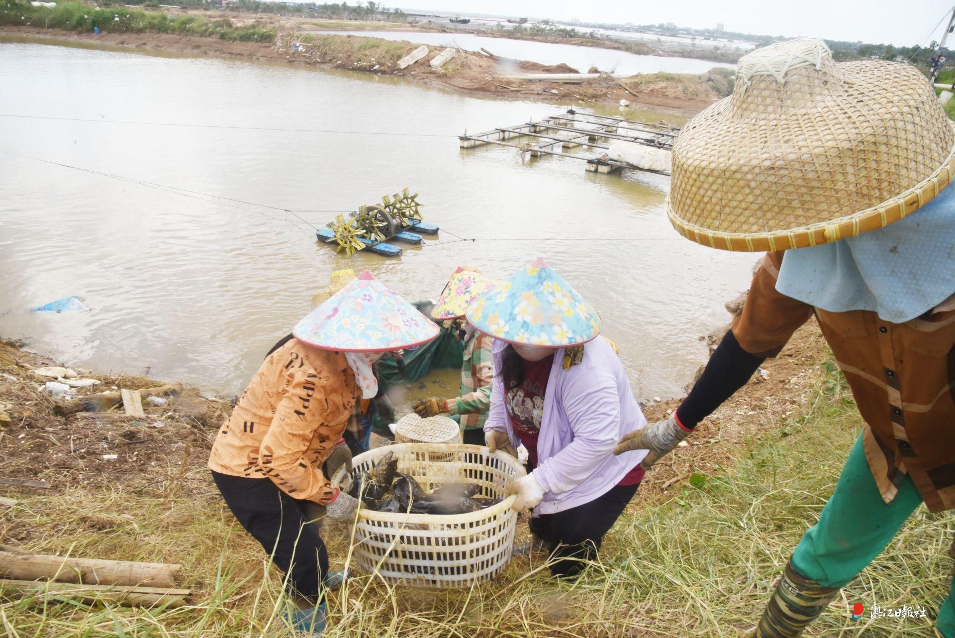 雷州覃斗镇英彩村养殖户和村民抢收鱼虾。(通讯员供图)