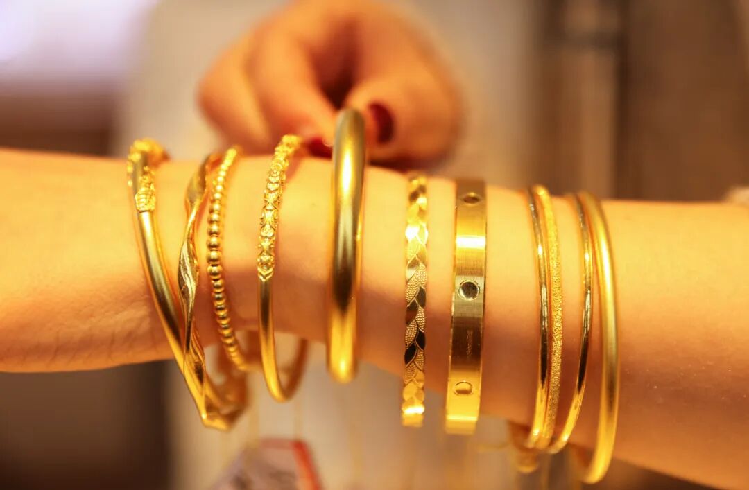 在浙江省湖州市德清县乾元镇一家金店,店员展示黄金首饰。新华社发(倪立芳摄)
