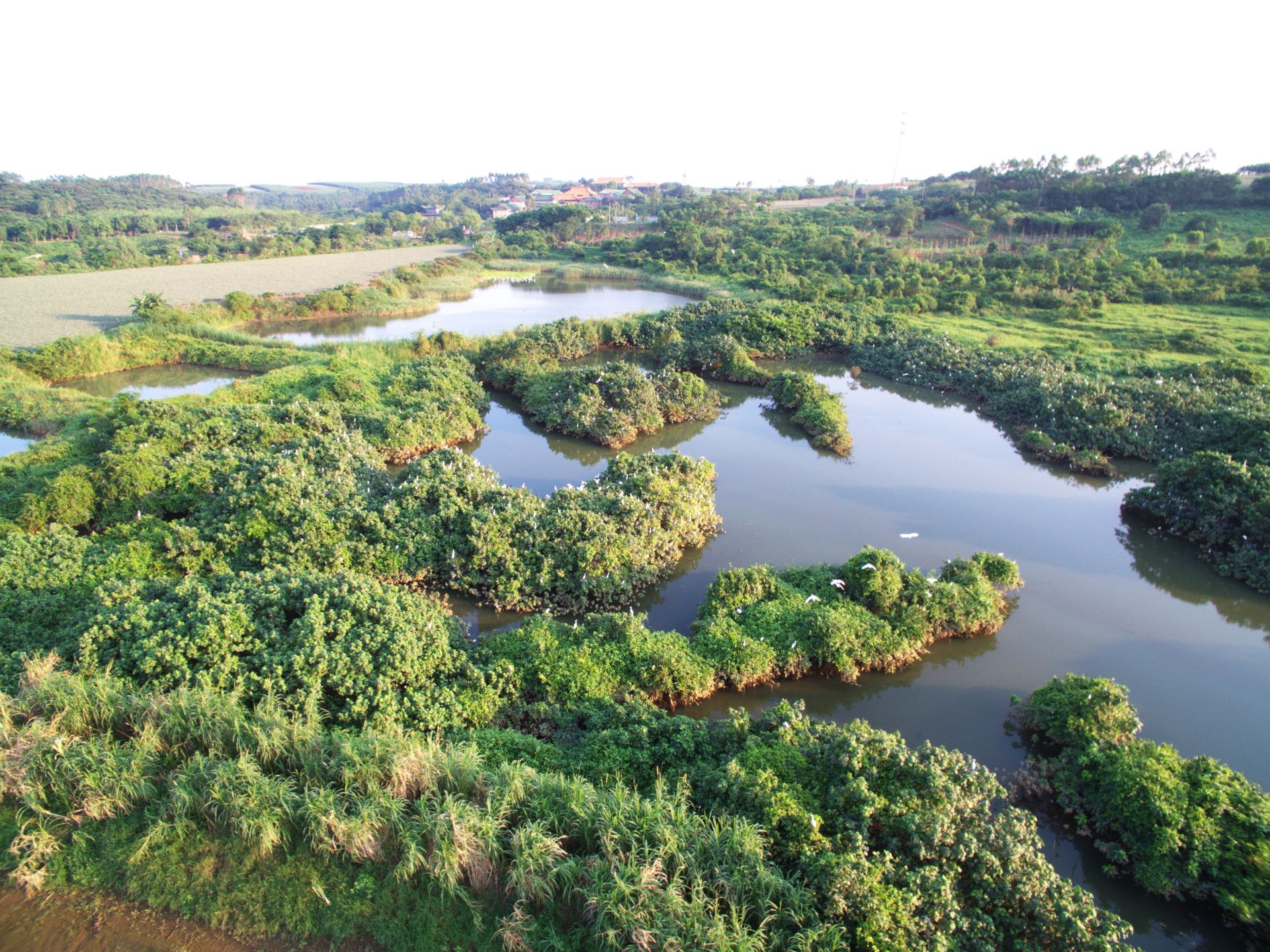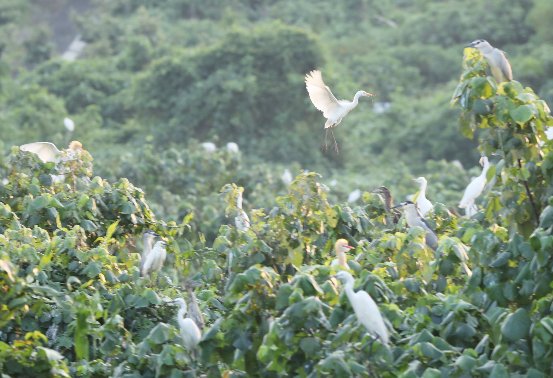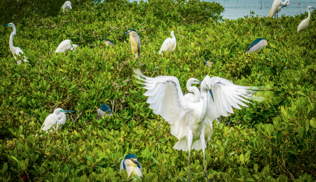 园内纵横交错的河网和郁郁葱葱的红树林为鸟类营造极佳生态环境。蓝天白云之下,红树林林冠之上,不时可见多种鸟类与天海交相辉映,构成一幅美轮美奂的画面,令人如痴如醉。