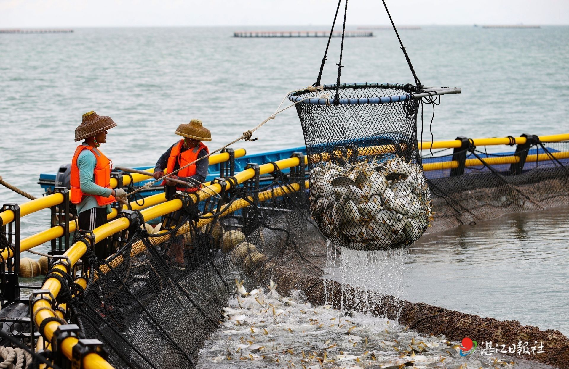 雷州流沙湾海洋牧场的金鲳鱼捕捞。