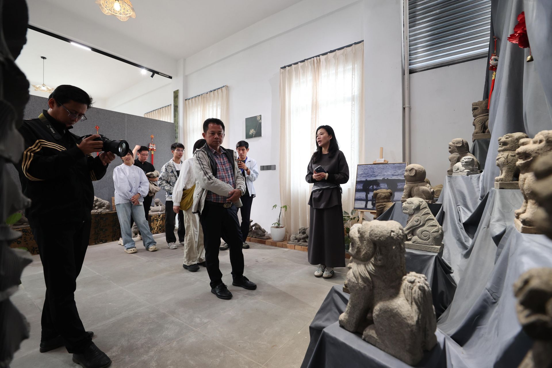 “这尊石狗是雷祖祠的标志性作品,承载着雷州半岛千年民俗文化。”当日10时许,广东应葵雕刻艺术有限公司内,总经理、雷州石狗非遗传承工作室主理人陈苗,向媒体记者团介绍石狗雕像,引得众人驻足观察纹理、拍摄记录,探寻非遗艺术魅力。