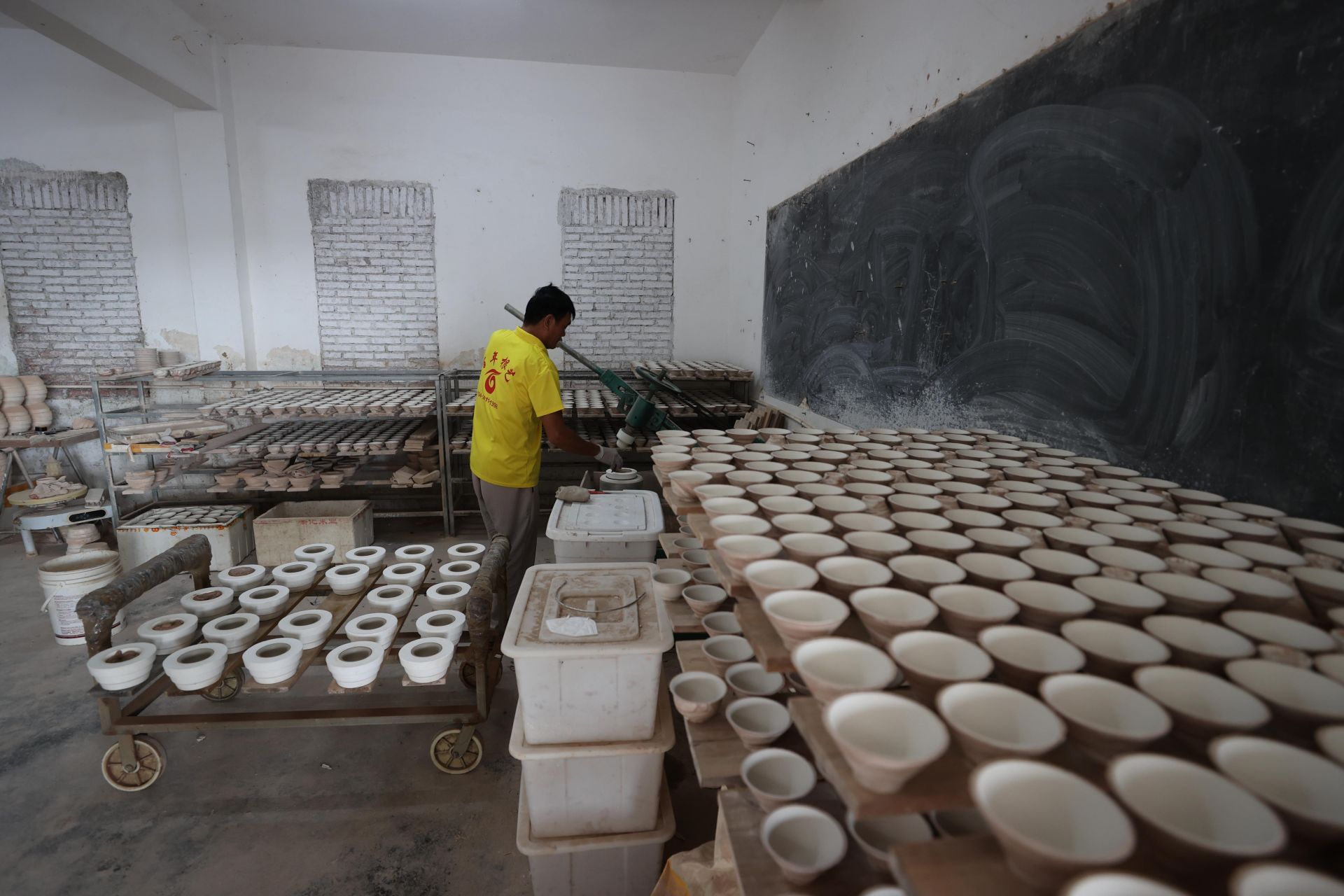 在雷州窑生产车间,工人正操作传统机器制作瓷坯,一排排素坯茶具整齐码放在木架上。另一旁的工人则专注地修坯、上釉。“我们的雷州窑产品0添加,纹理都是天然形成的。”陈国玉补充道,电窑烧制需经两次高温,先烧素坯,再烧上釉层,每一件成品都凝聚着传统工艺的智慧。