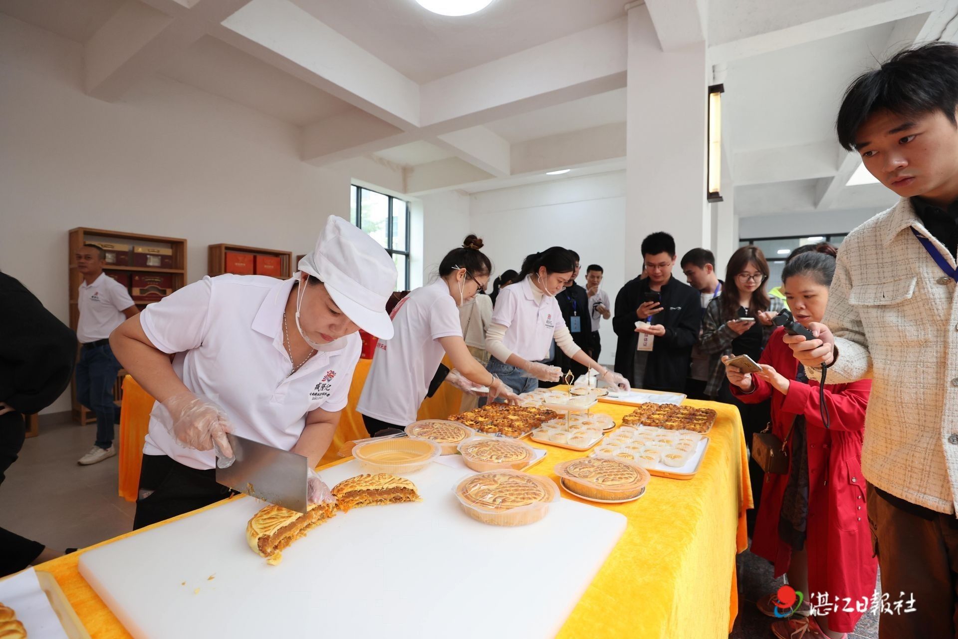 媒体记者团探访广东臧隆记食品有限公司,品尝刚出炉的菠萝月饼。