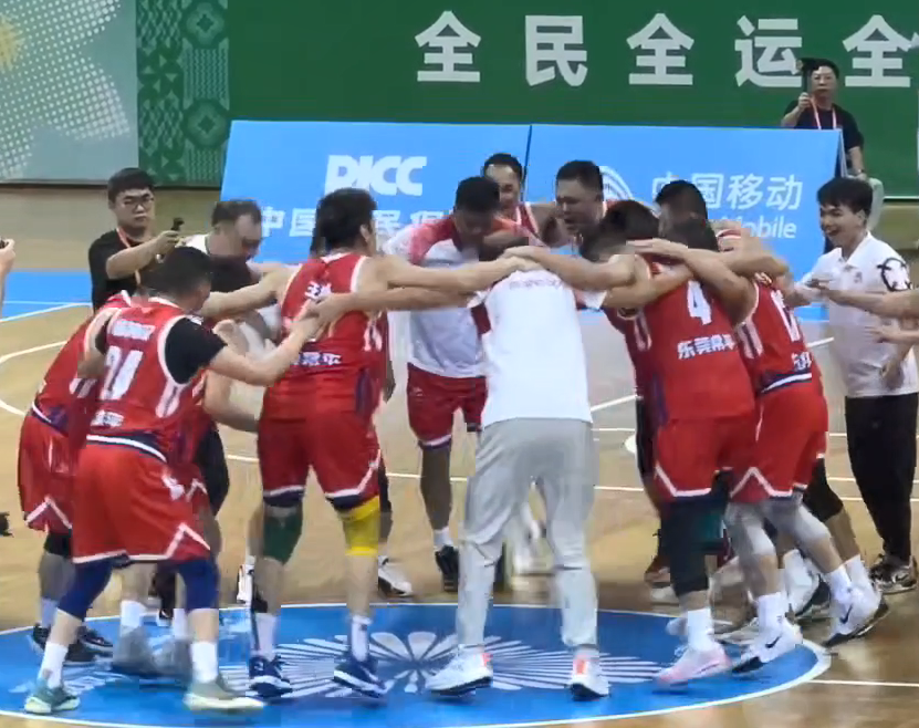 25日半决赛,代表广东队参赛的湛江籍球员吴宏辉(戴红帽者)在守门,湛江籍球员谭恒业(左二,张开左臂、戴蓝帽者)在高高跃起防守。(受访者供图)
