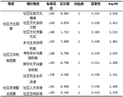 首先,社区文化因素中社区文化精神和社区文化活动次数的显著性均小于0.05,结果较为显著。①社区红色文化精神对学生党建工作模式创新具有较大地影响,红色文化精神为学生党建工作模式提供了丰厚的土壤和独特的文化氛围。②社区文化活动的次数,为学生党建工作模式提供了更多实践和创新的机会。
