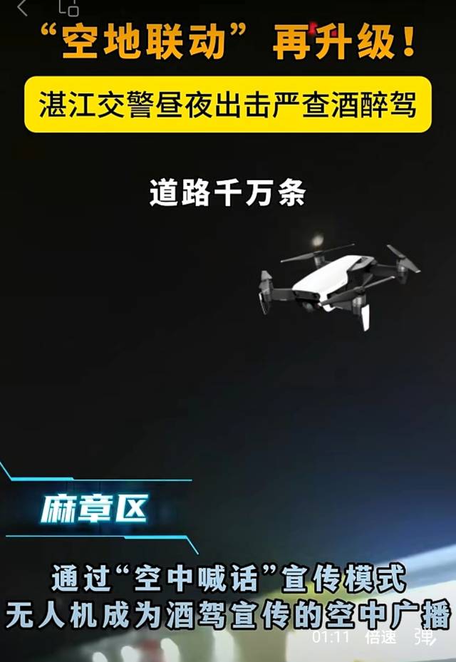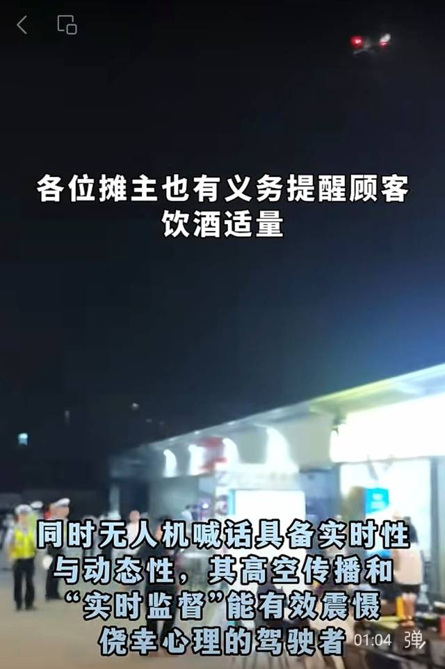 “我们是湛江交警,道路千万条,安全第一条,开车不喝酒,喝酒不开车,各位摊主也有义务提醒顾客饮酒适量,珍爱生命,拒绝酒驾”——夜幕降临后,无人机搭载高清摄像头与喊话装置,在夜宵聚集区上空灵活巡航,既精准覆盖了室内宣传难以触及的室外场景,又以新颖的“空中提醒”方式吸引市民关注,让酒驾警示声声入耳,让经营人员强化责任义务。
