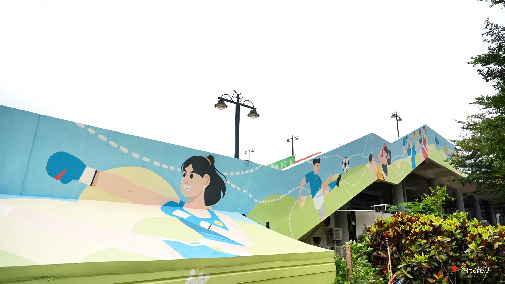 步入湛江奥体中心,全运主题元素随处可见。主干道两侧醒目的指引牌一路延伸,体育馆周边墙面及支撑柱均绘有动感彩绘涂鸦,与周边提升的绿化环境相得益彰。场馆入口处,十五运会吉祥物“喜洋洋”和“乐融融”的立体雕塑俏皮伫立,与远处的海湾大桥遥相呼应,构成一幅活力四射的体育画卷。