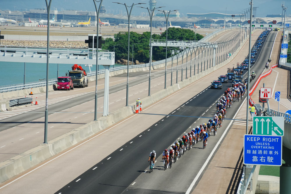 十五运会公路自行车男子个人赛,参赛选手在澳门大桥段赛道竞速。