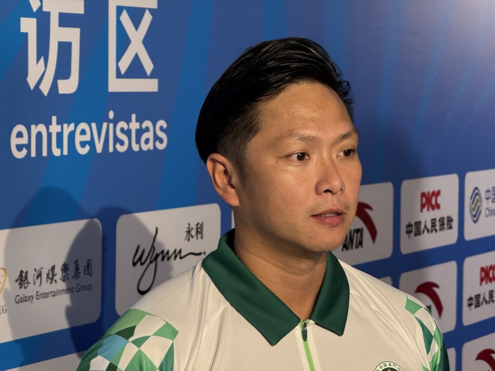 11月10日,澳门队主教练张嘉俊赛后接受采访。新华社记者 胡佳丽 摄