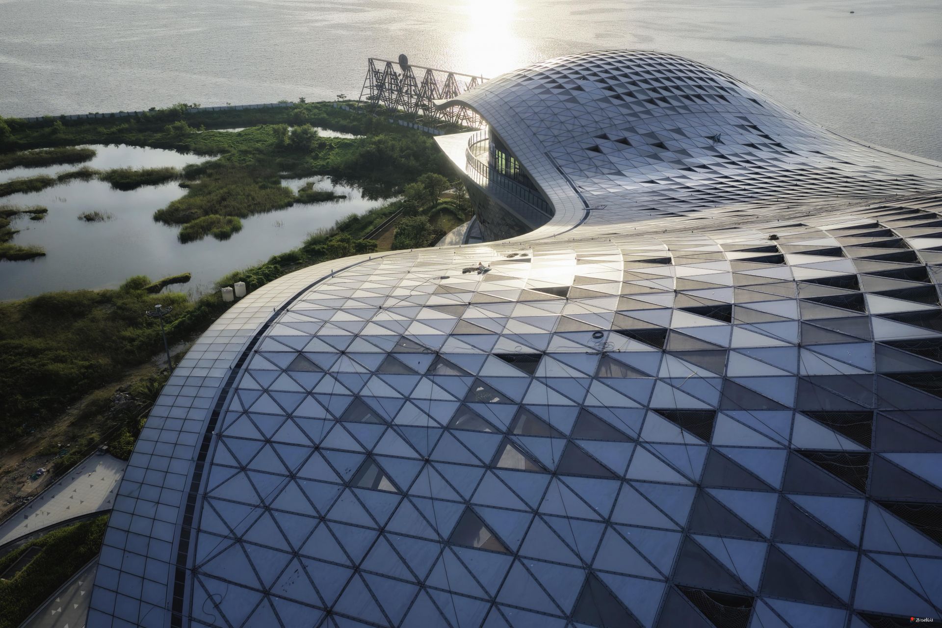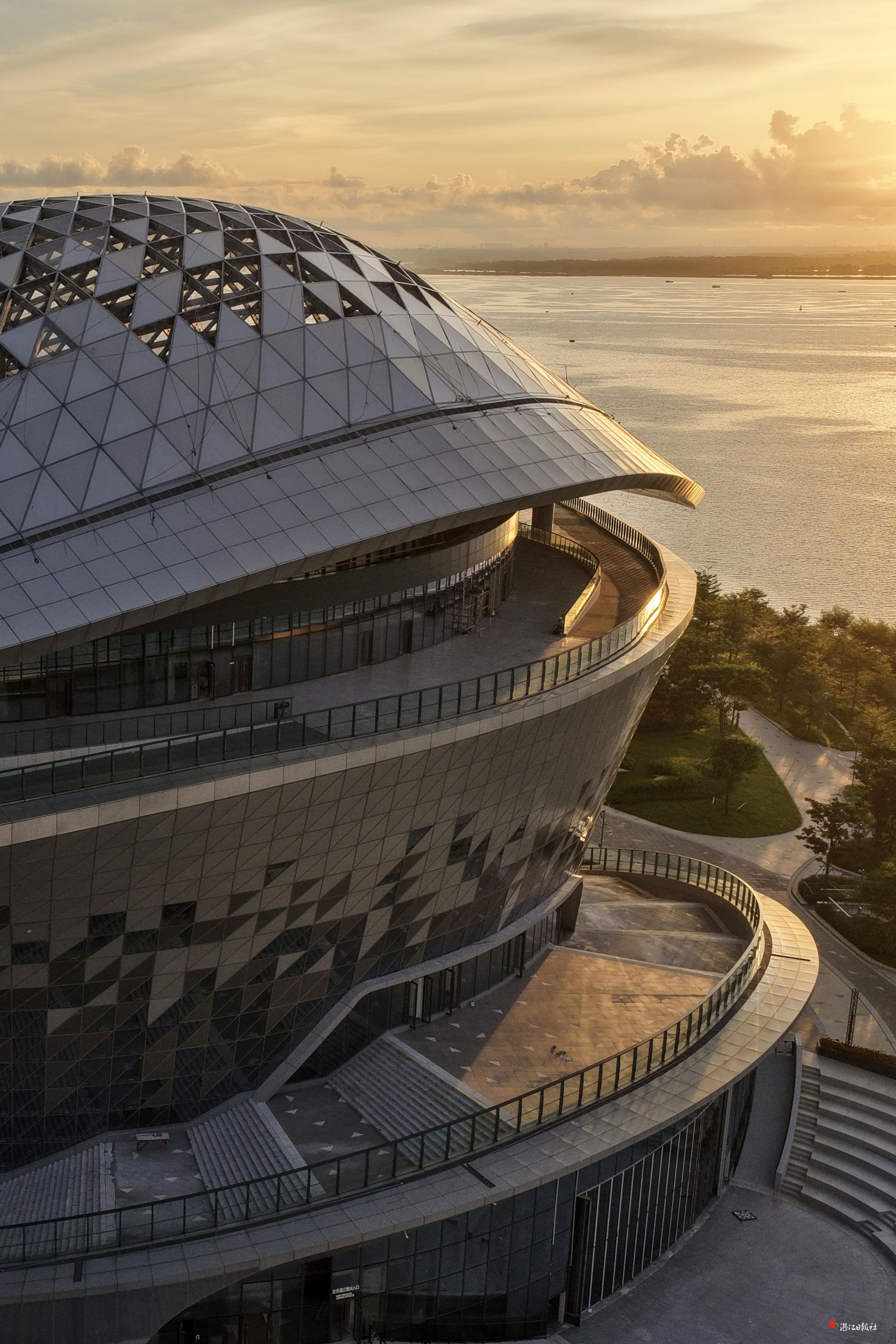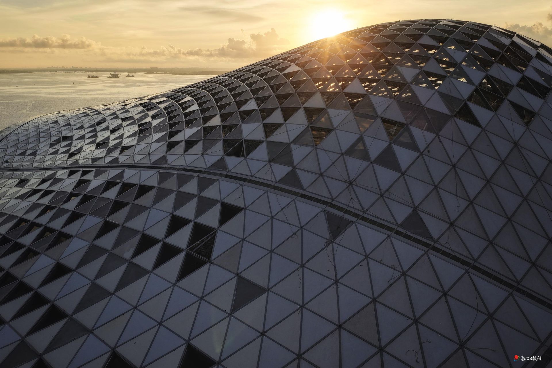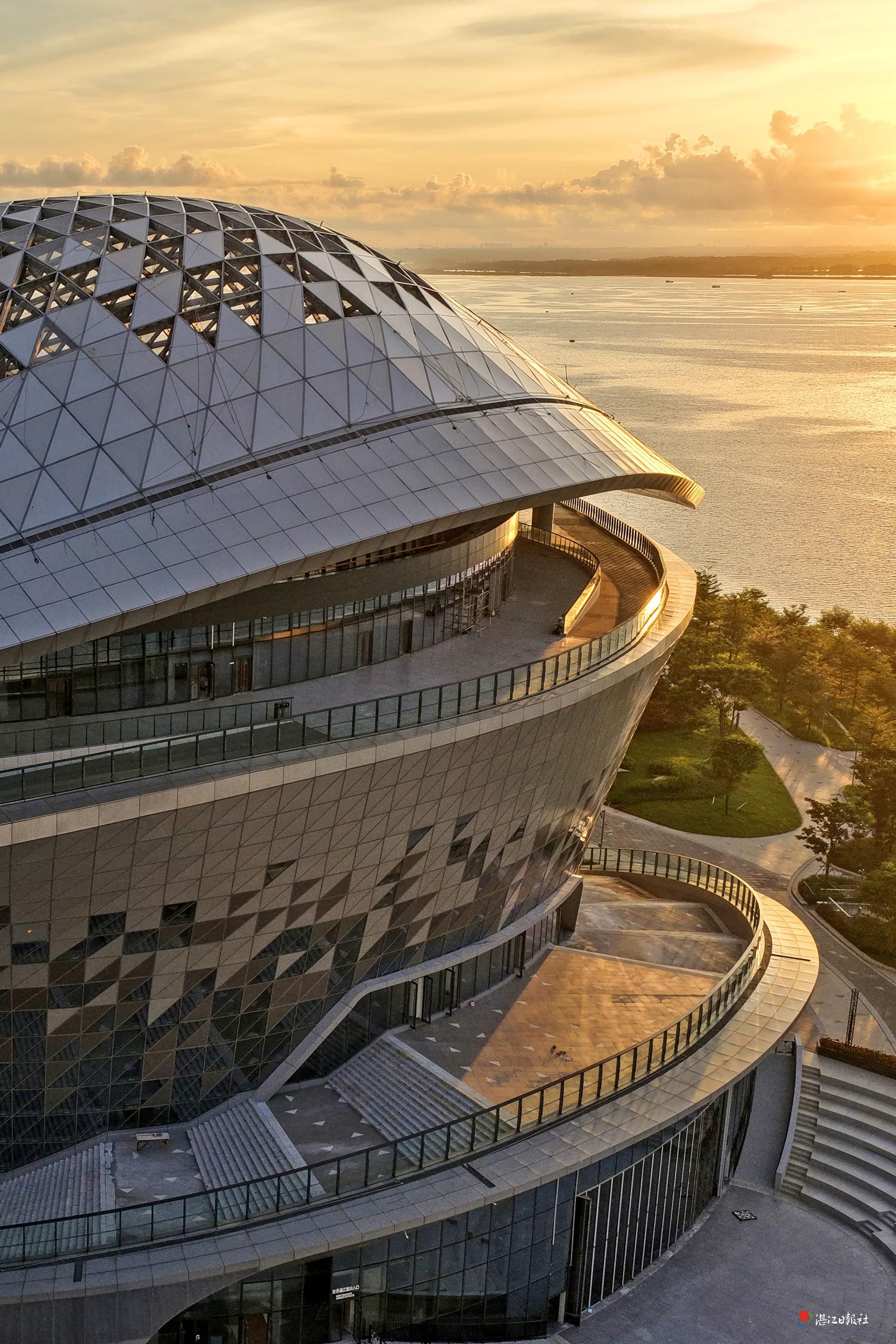 - 日出时分,记者在湛江文化中心看到,阳光穿透云层,洒在鳞片状的建筑立面上,折射出深浅渐变的光影。波光粼粼的海面上,建筑的倒影随浪起伏,与远处的桥梁和城市天际线交相辉映。
