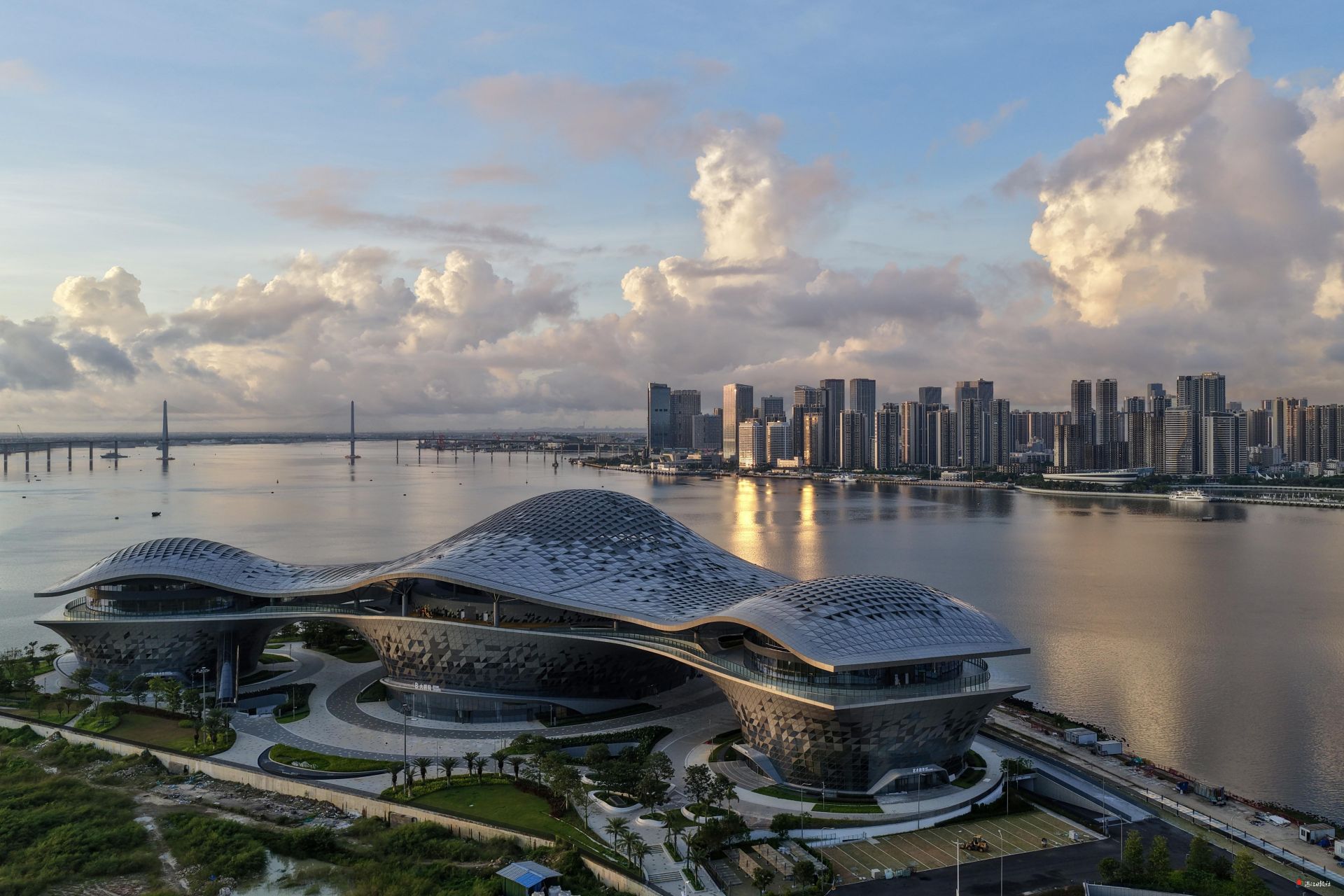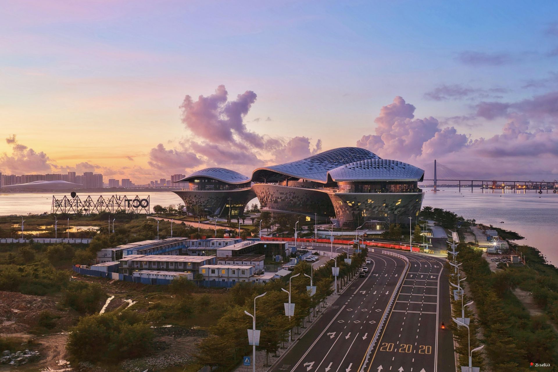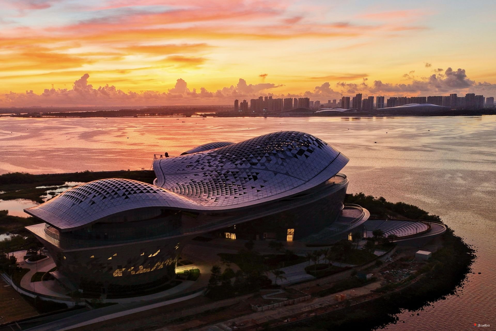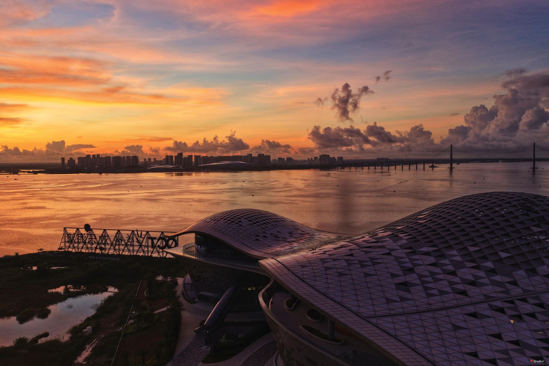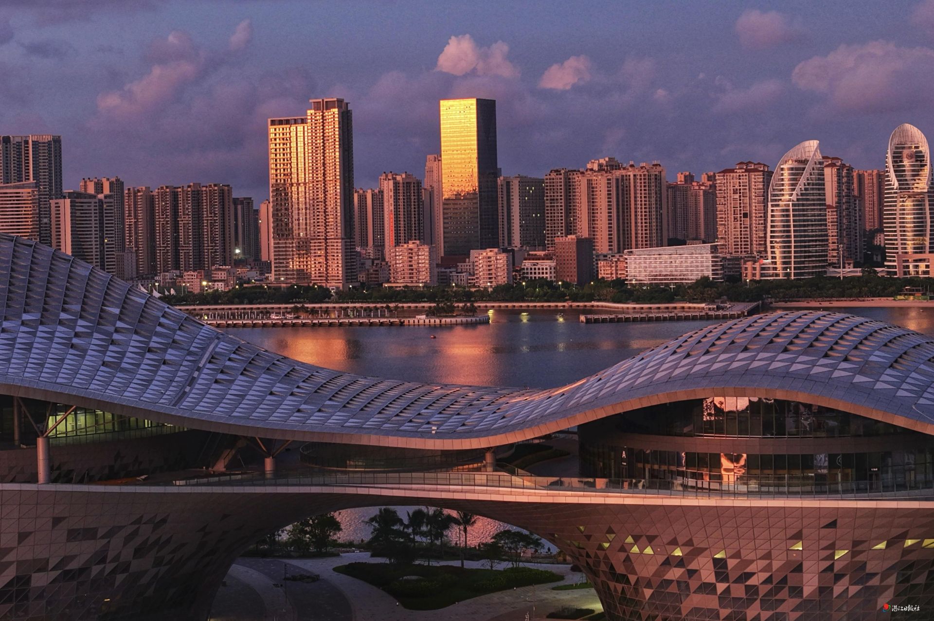 - 日出时分,记者在湛江文化中心看到,阳光穿透云层,洒在鳞片状的建筑立面上,折射出深浅渐变的光影。波光粼粼的海面上,建筑的倒影随浪起伏,与远处的桥梁和城市天际线交相辉映。