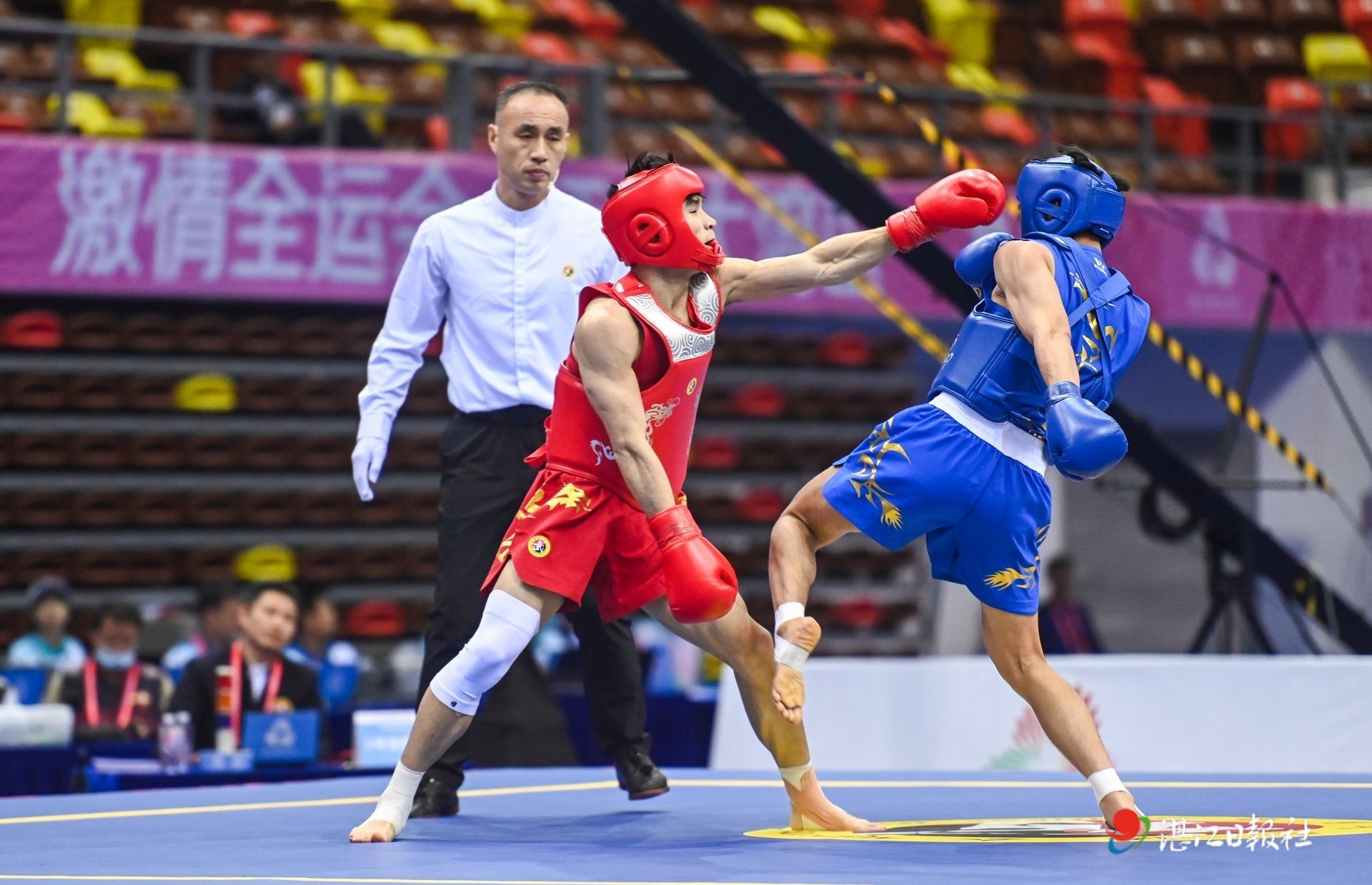 11月13日晚,十五运会武术散打比赛男子60公斤级项目1/8决赛在湛江奥体中心体育馆进行,代表广东队出战的湛江籍运动员王艺霖奋勇拼搏,以2:0战胜了澳门队选手古晓岚,昂首晋级八强。