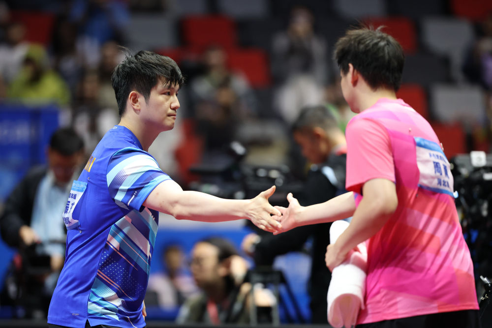 11月15日,樊振东(左)和王楚钦在比赛后握手致意。新华社记者 周密 摄