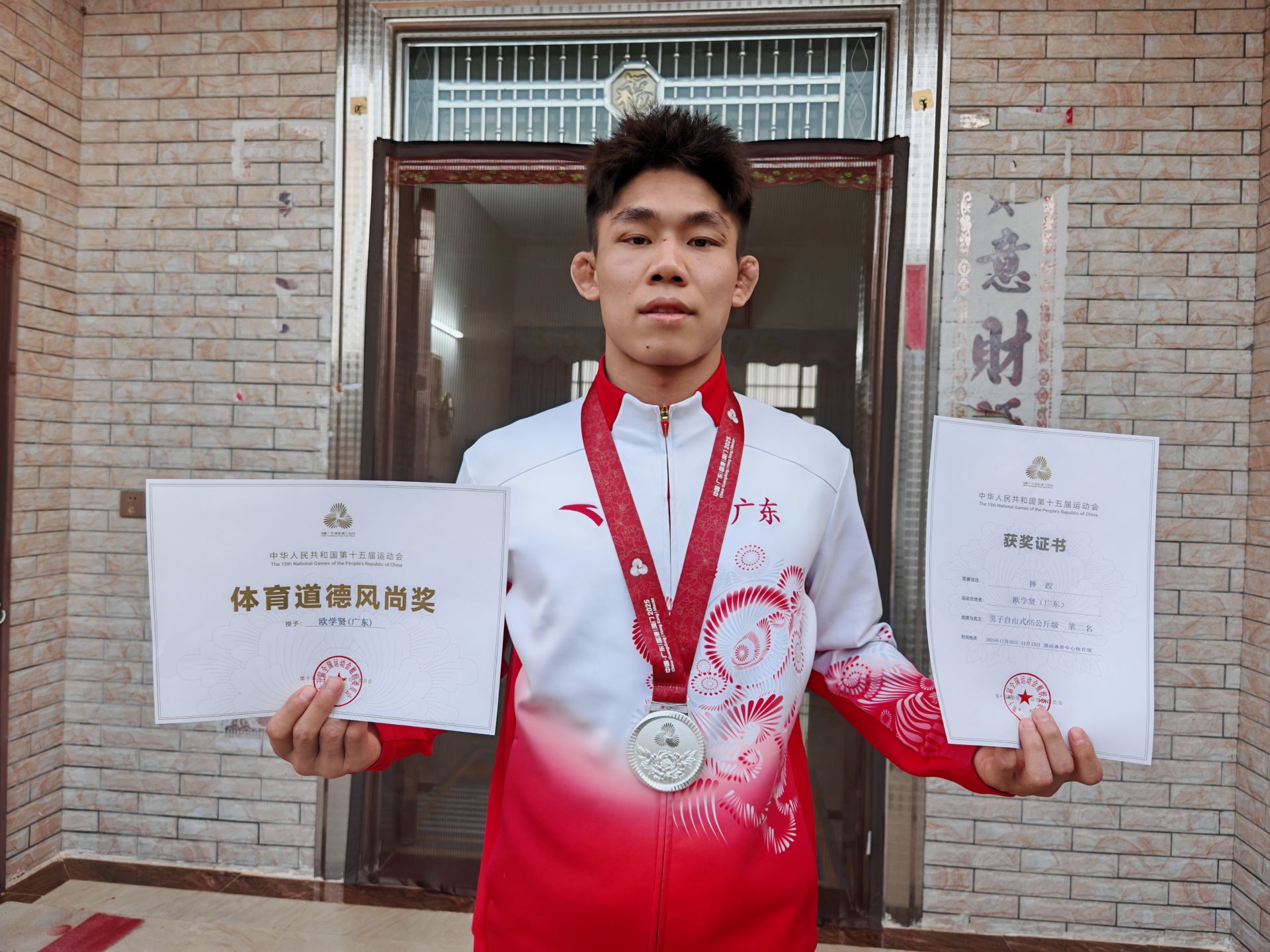 11月16日,刚刚参加完第十五届全运会荣获男子自由摔跤65公斤级亚军的雷州籍运动员欧学贤,回家乡省亲。