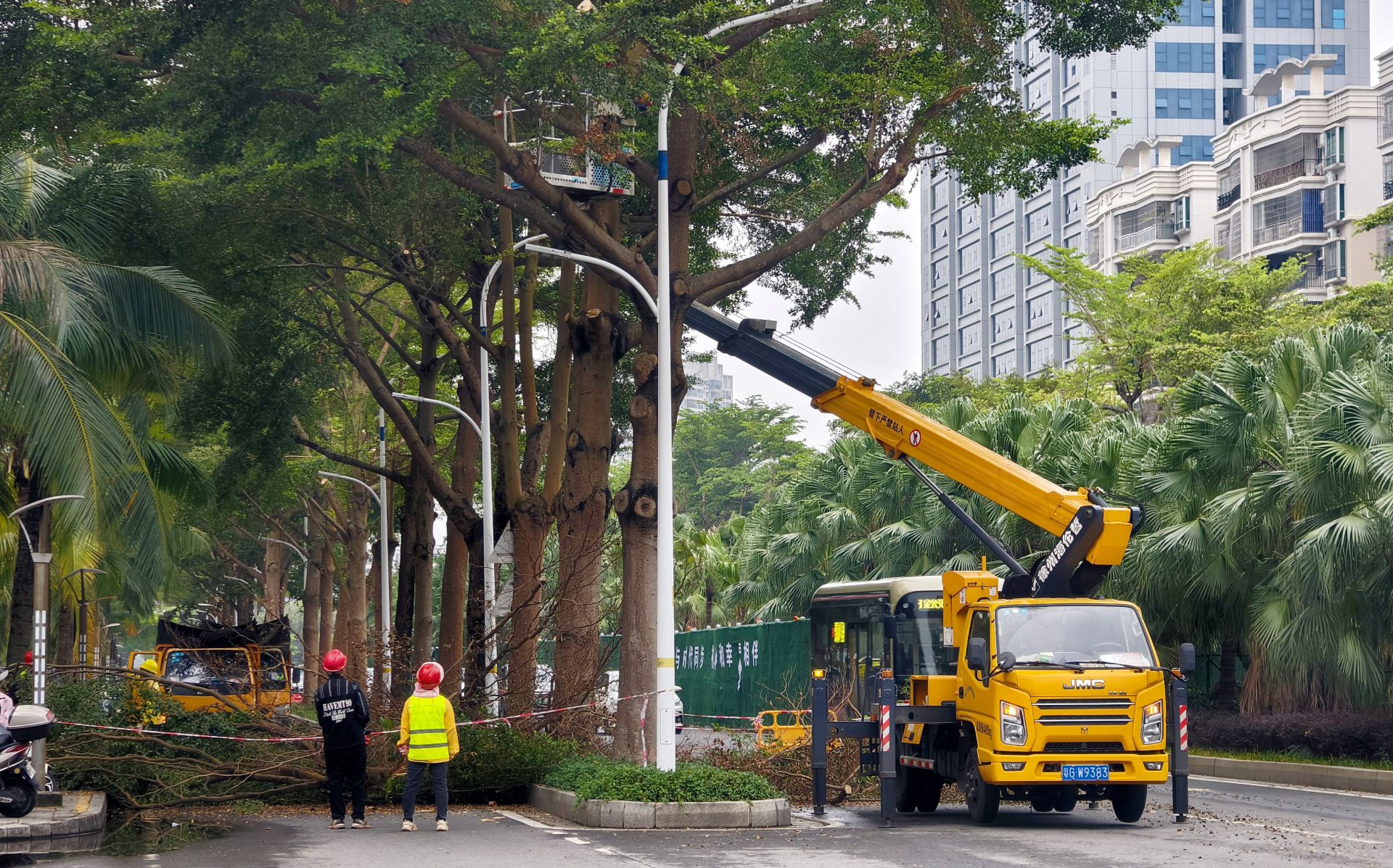 11月20日,湛江经济技术开发区市政园林绿化工人在人民大道中开展大王椰枯枝清运作业。