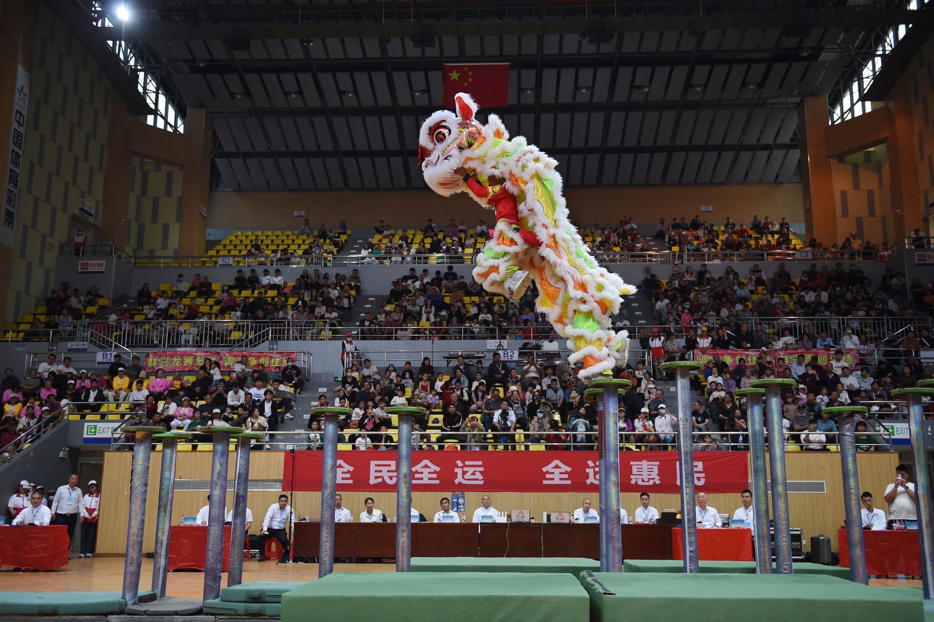 南狮高桩比赛现场。